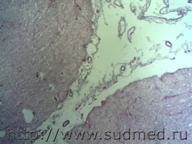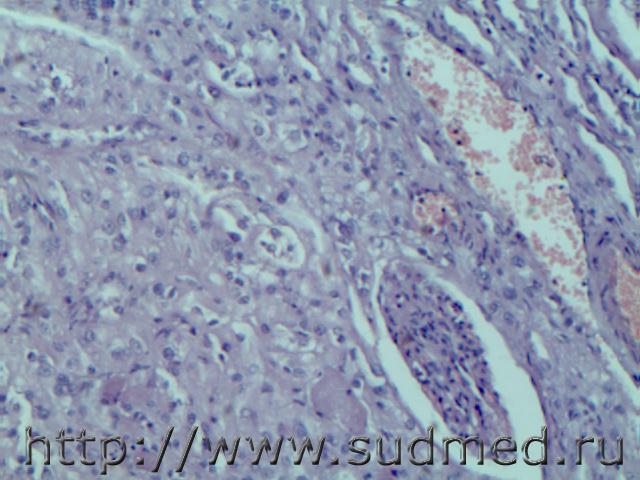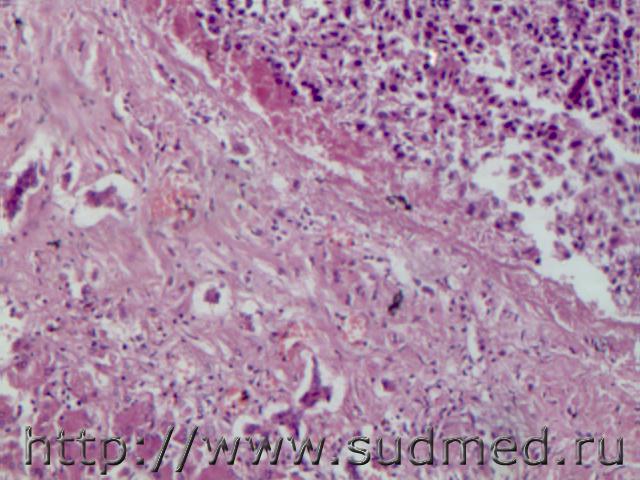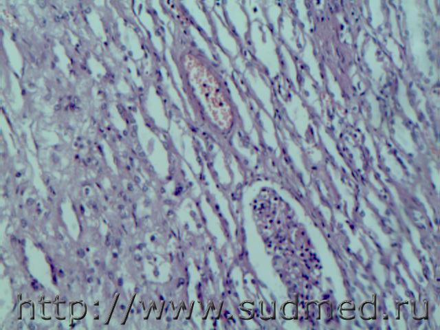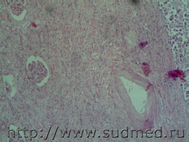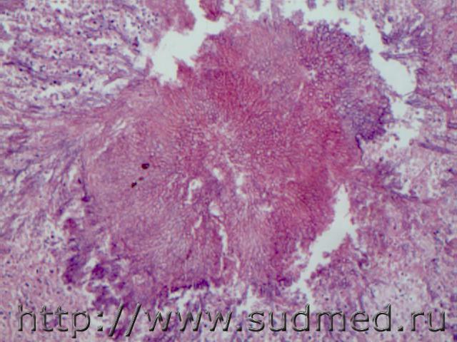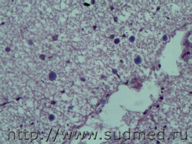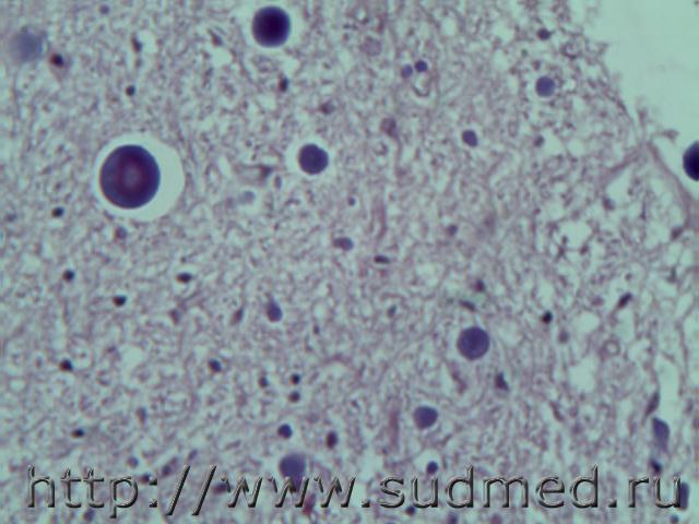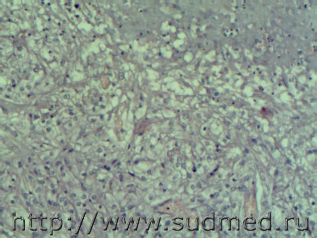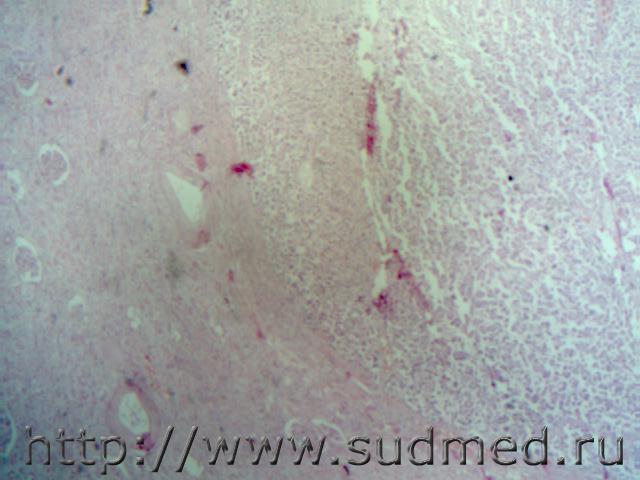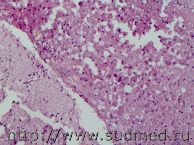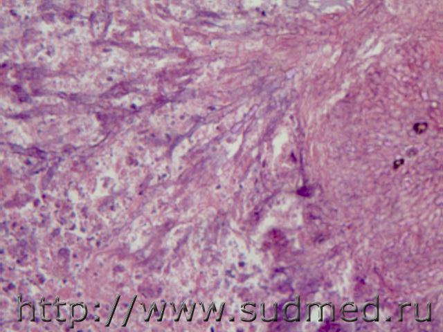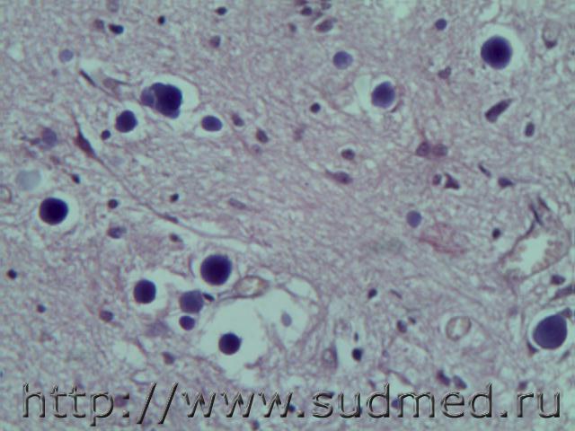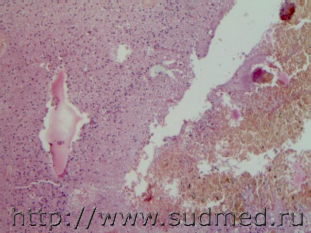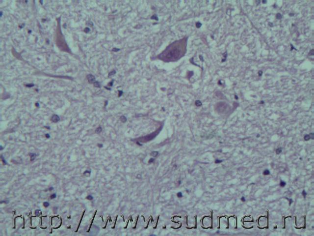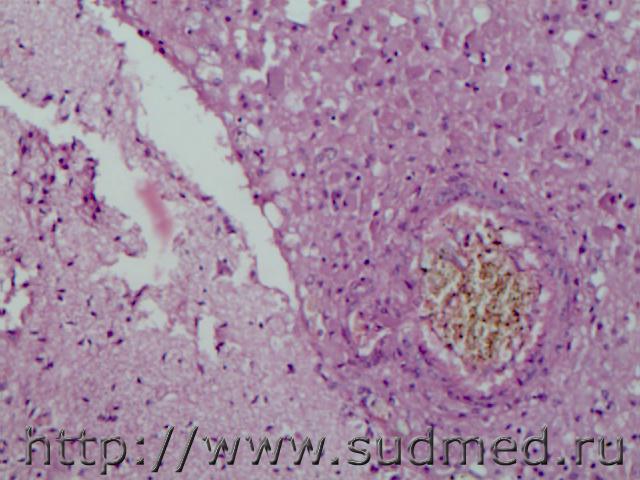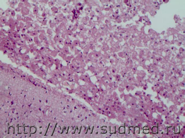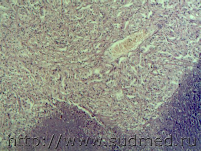 Тот же случай.ЗЧМТ.за 12 к\д изменение мягкой мозговой оболочки со множеством зернистых оксифильных шаров. В веществе коры г/м видны очаги ишемического размягчения и кровоизлияния, отек, дистрофия. некробиоз и некроз нейроцитов.