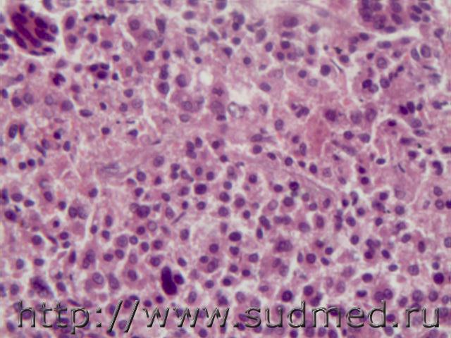 Аденоматоз печени с переходом в карциному( видны помимо гиперхромности и единичные патологические митозы)