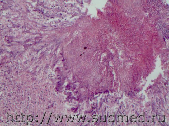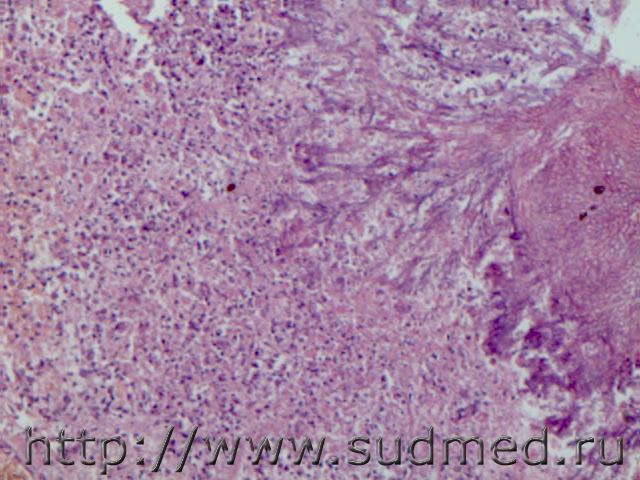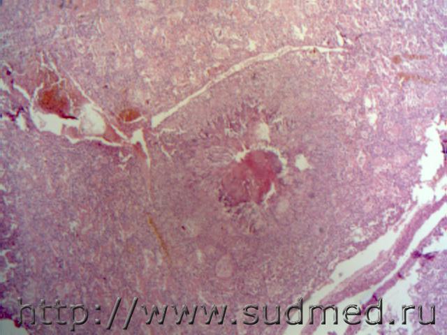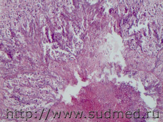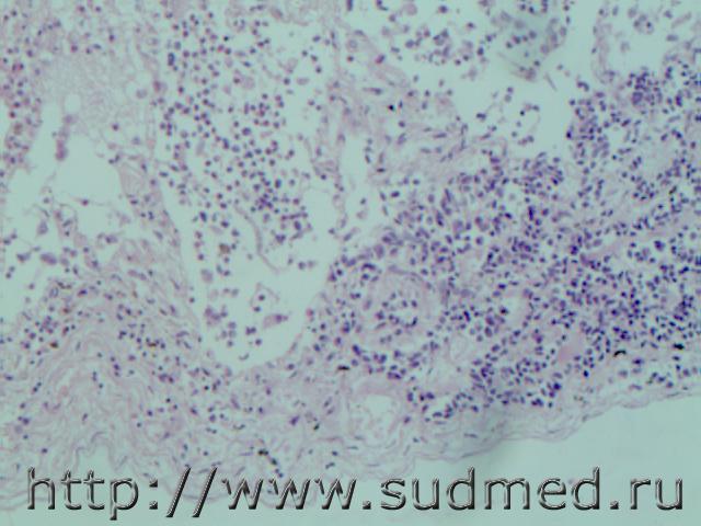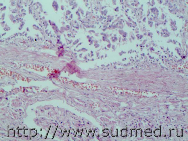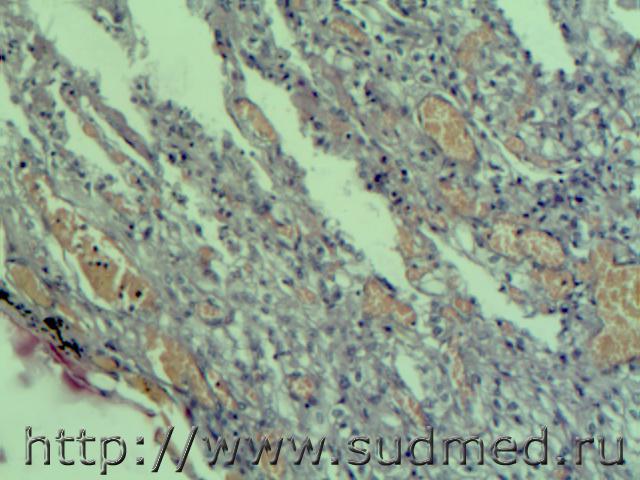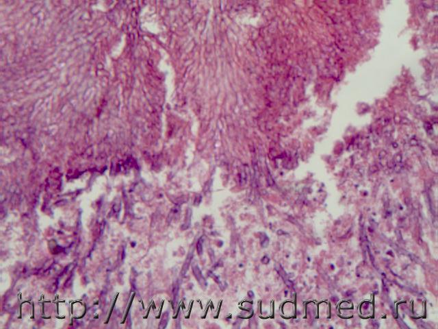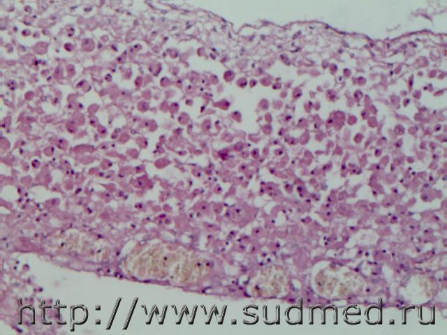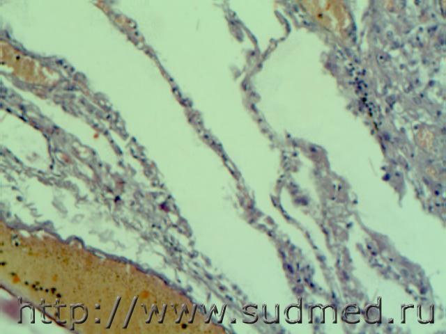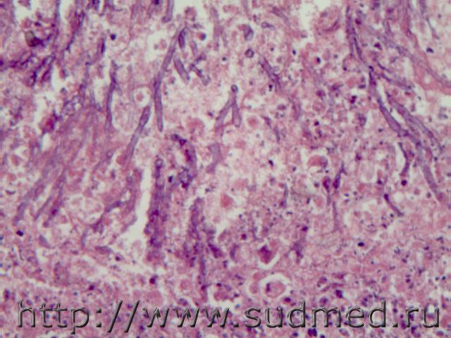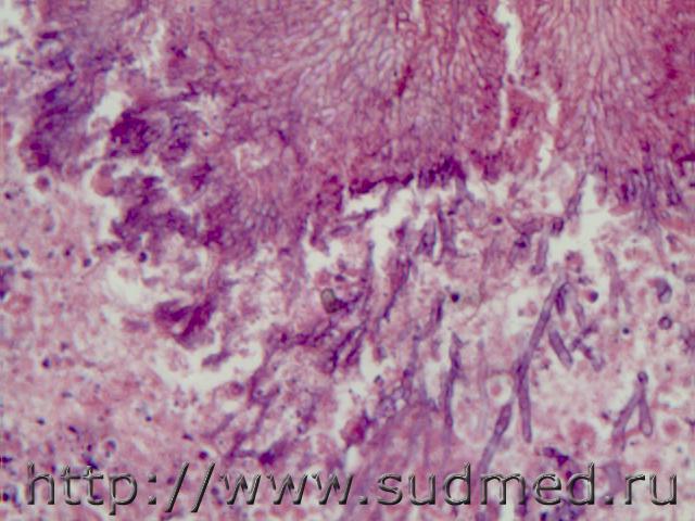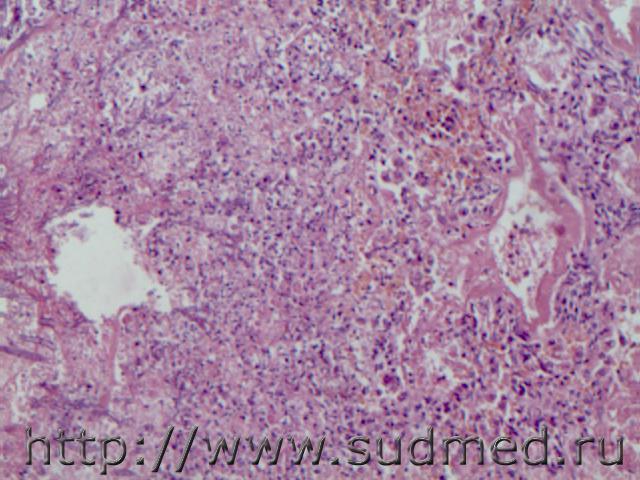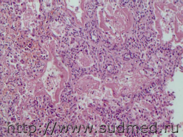 Реб. возраст 1.5 мес. ЗЧМТ. 12 к/д. Признаки РДСН(гиалиновые мембраны, отек, кровоизлияние,ателектазы) с грибковым поражением легких.