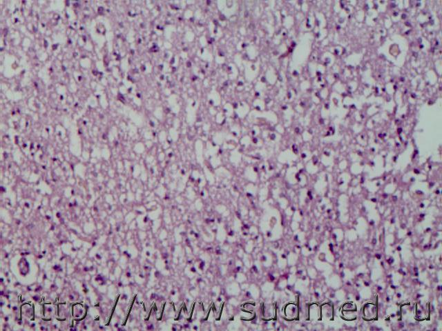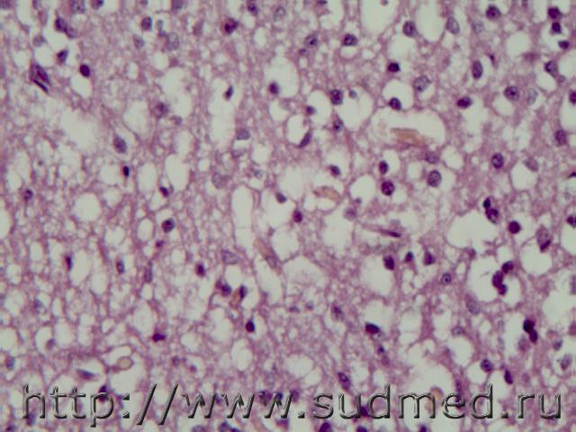 М.70 лет.ЦВЗ. Ишемический восходящий отек спинного мозга(гематоксилиновые тельца, хронический менингит.) В белом веществе виден войлочность (ишемическое разрежение субстрата)рисунка,нейроциты в сером веществе набухшие с зернистостью цитоплазмы с гомогенизацией ядер. Эпителии центрального канала в состоянии реактивной пролиферации, стенка артериол МО склеротически изменены.МО с умеренной лимфоцитарной инфильтрацией с примесями арахноидэндотелии, глиальных макрофагов с единичными плазмацитоподбными клетками.
