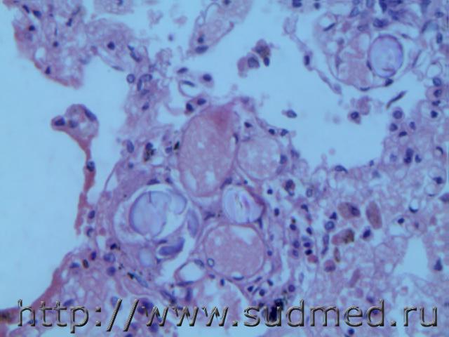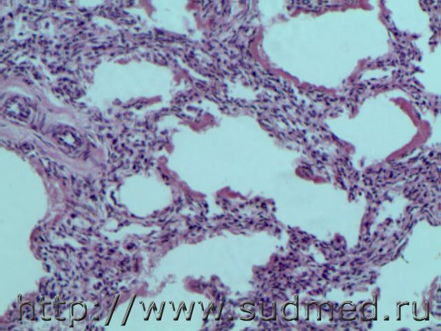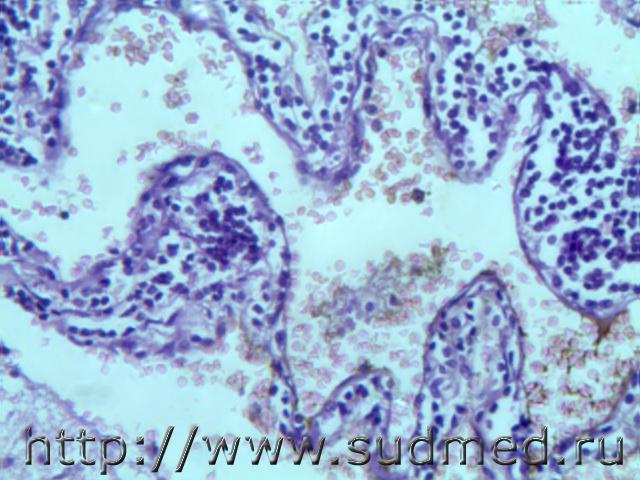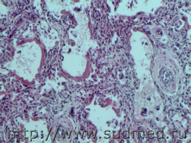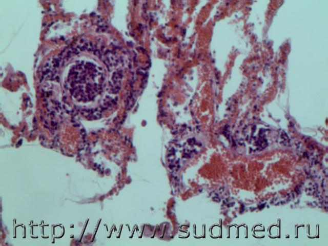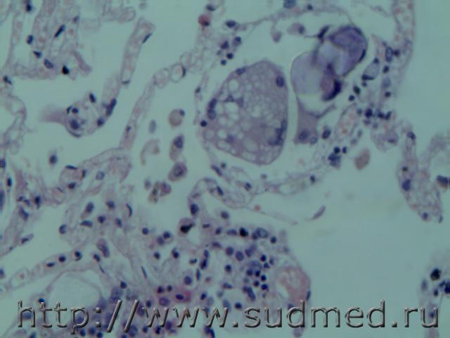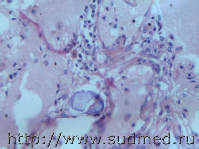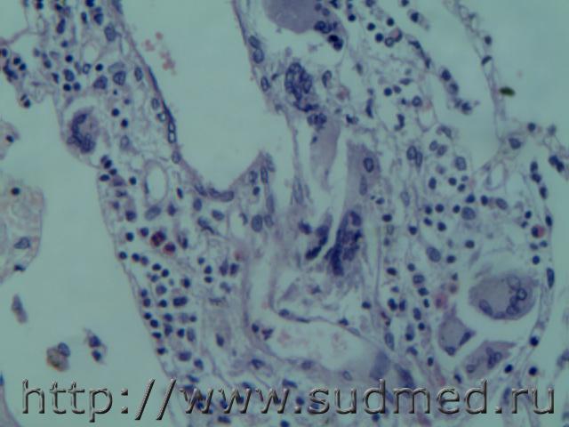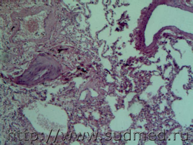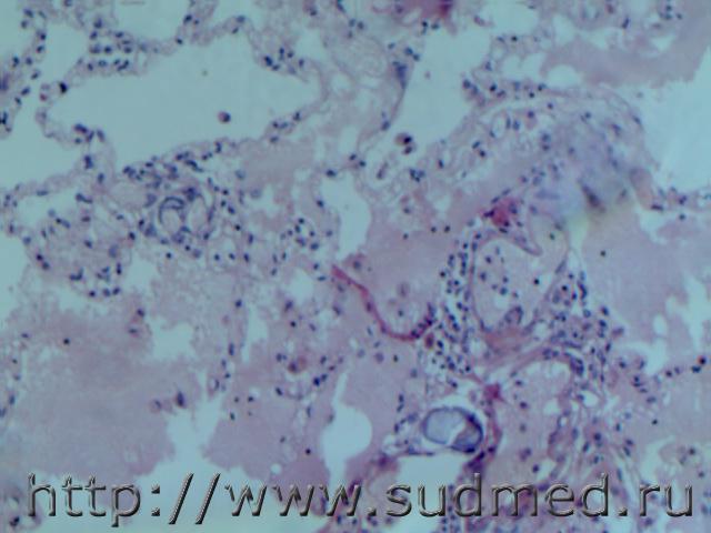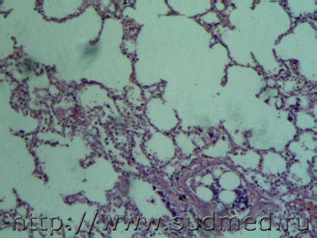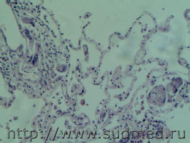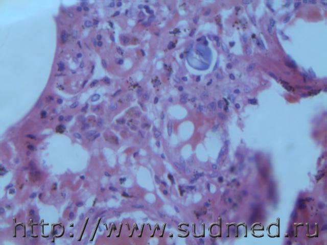 Отравление морфином( качественный хим.результат). В сосудах альвеолярных перегородок видны кристаллики бледно-голубоватого цвета, продуктивный васкулит с гигантскими клетками по типу инородных тел. В печени хронический интерстициальный гепатит.