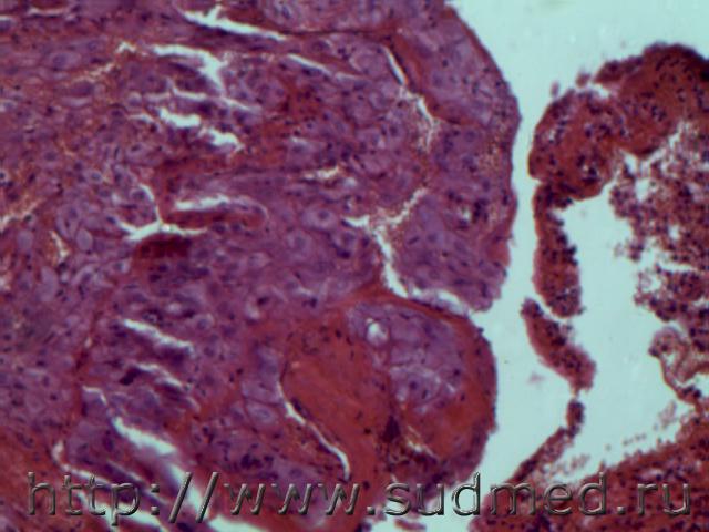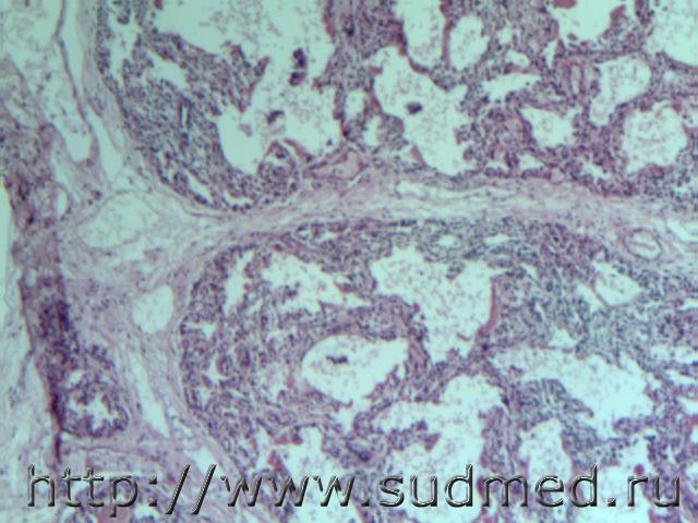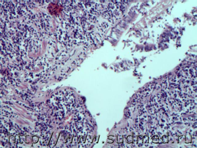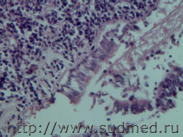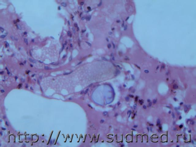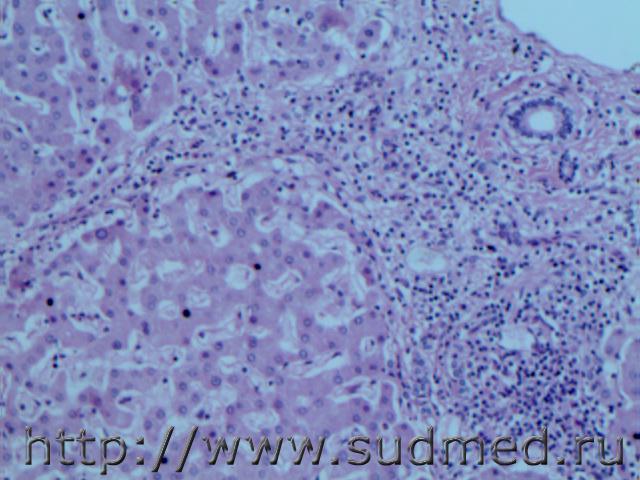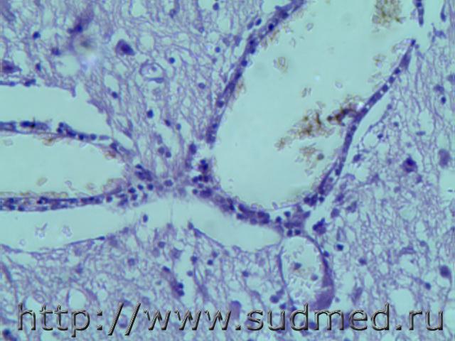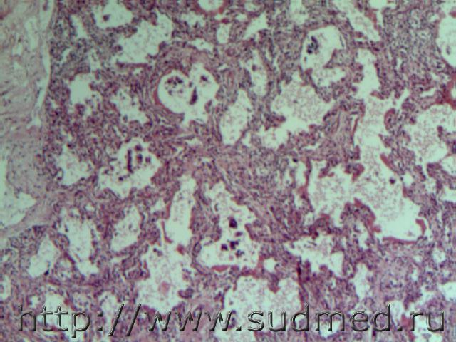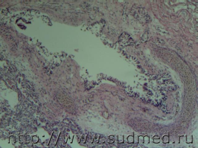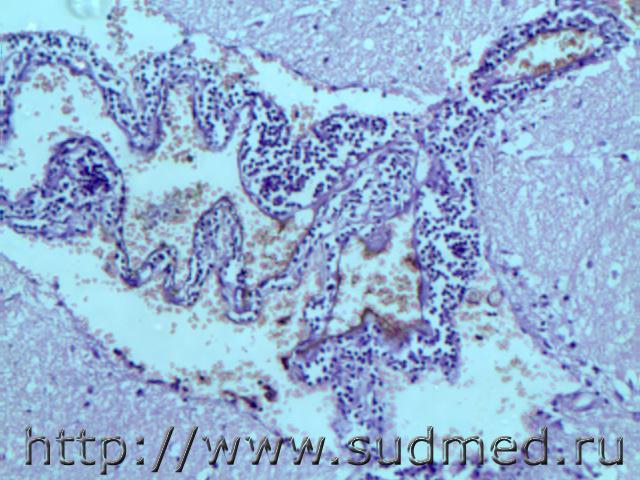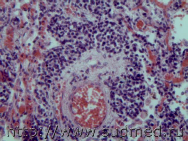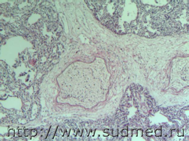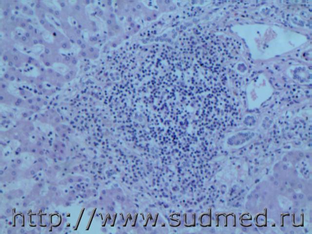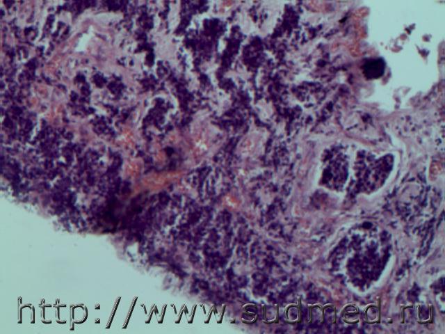 Отравление морфином( качественный хим.результат). В сосудах альвеолярных перегородок видны кристаллики бледно-голубоватого цвета, продуктивный васкулит с гигантскими клетками по типу инородных тел. В печени хронический интерстициальный гепатит.