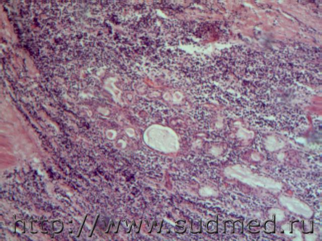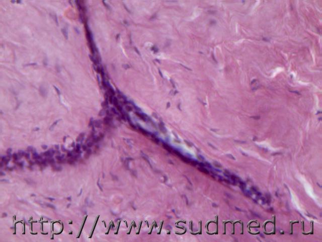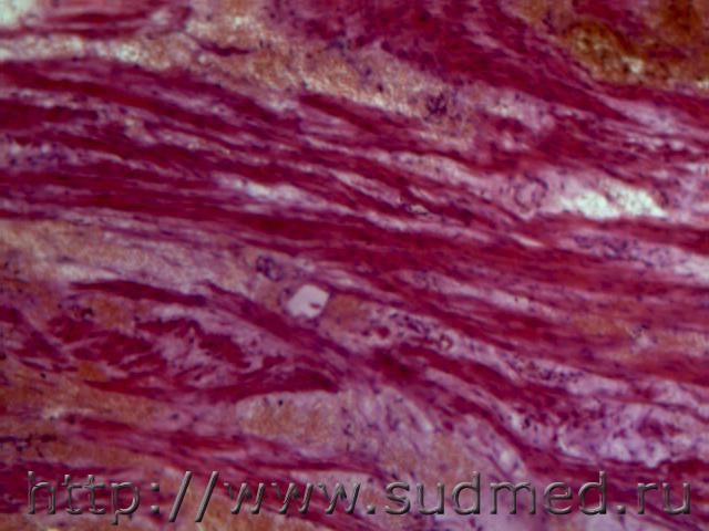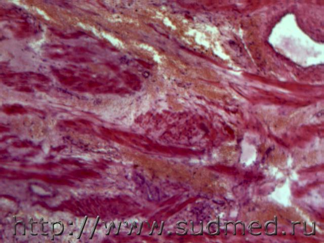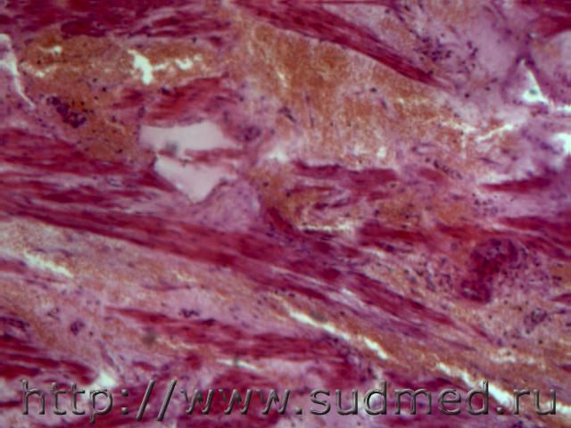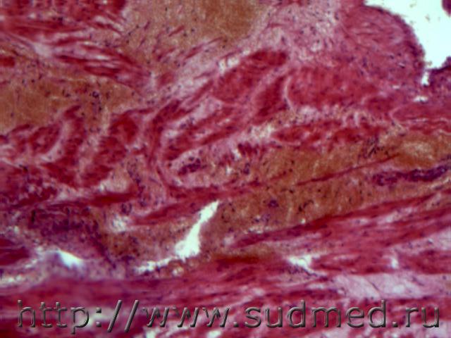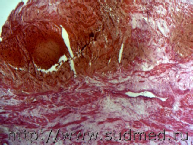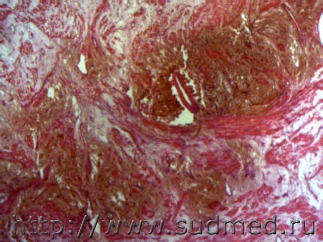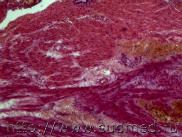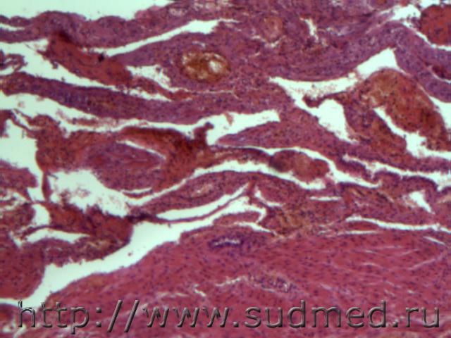 Гистологическая картина матки Кювелера( множественные кровоизлияния в интерстиции миометрия)