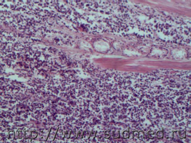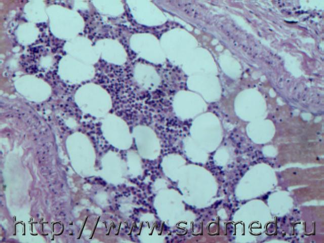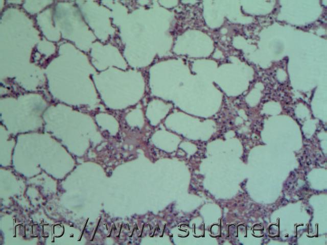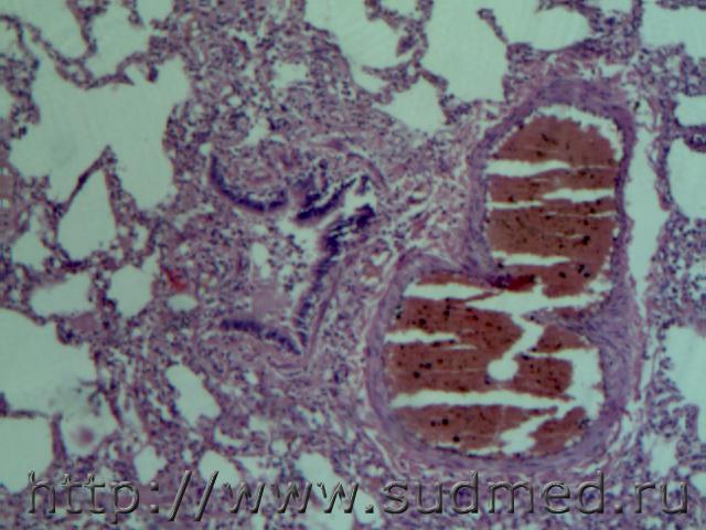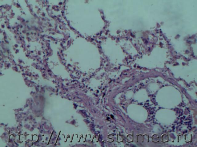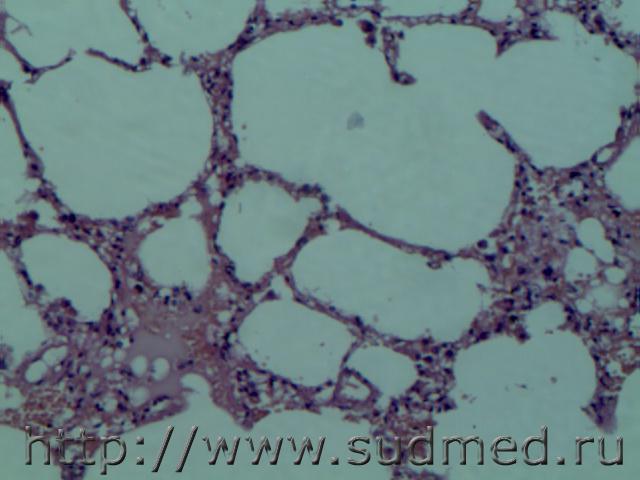 М.36 лет. Эмболия сосудов легких костномозговой жировой тканью с миелоидными элементами в разных сосудах легких. Видны очаги острой эмфиземы, кровоизлияния, дистония сосудов стромы легких.