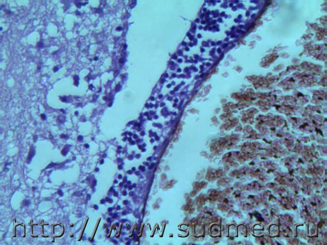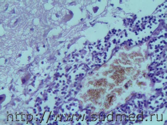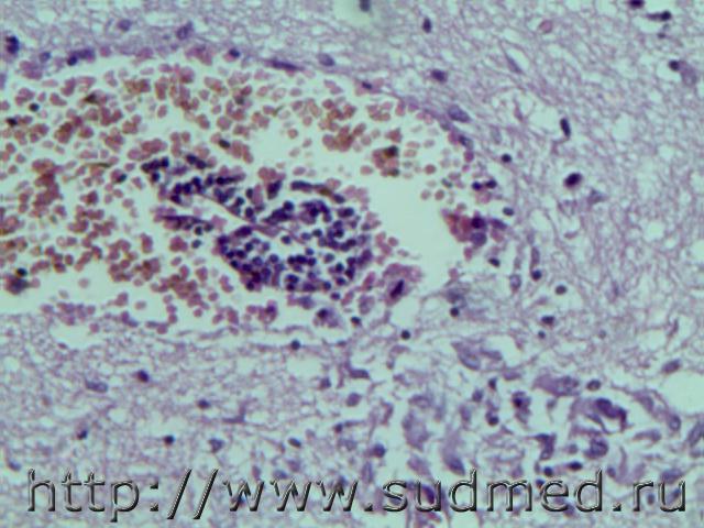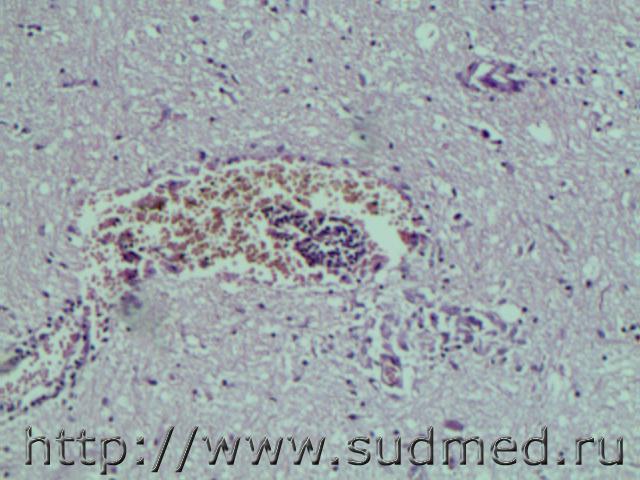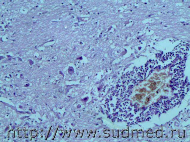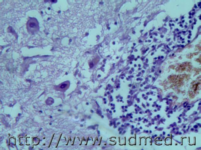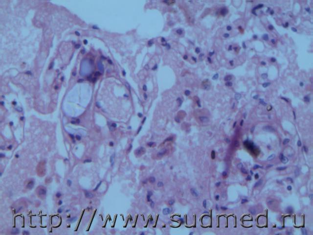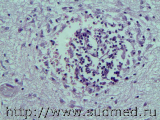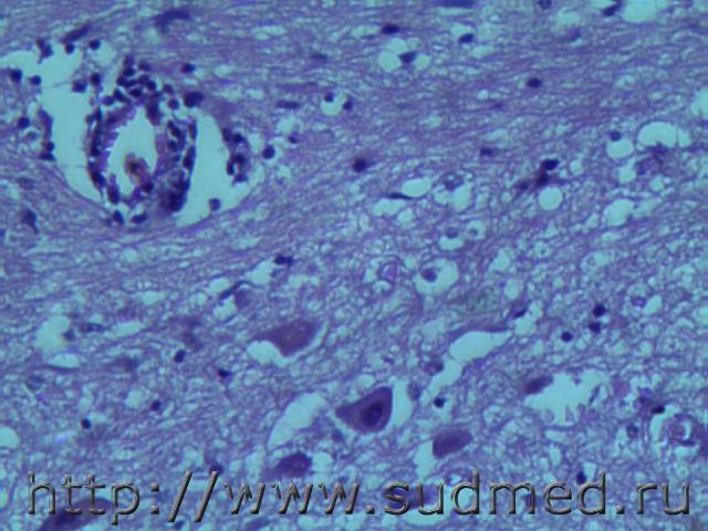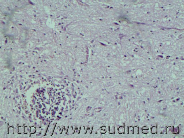 Цереброваскулит( стенка утолщена, разрыхлена и инфильтрирована круглыми клетками от интимы до адвентиции, местами с деструкцией стенки и с инфильтрацией окружающей ткани мозга. Видны ишемически измененные нейроциты). В других органах васкулитов не обнаружены.. Этиология неизвестна.