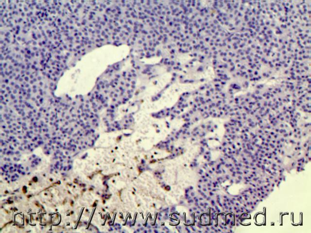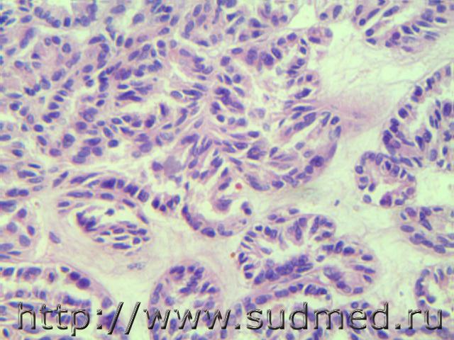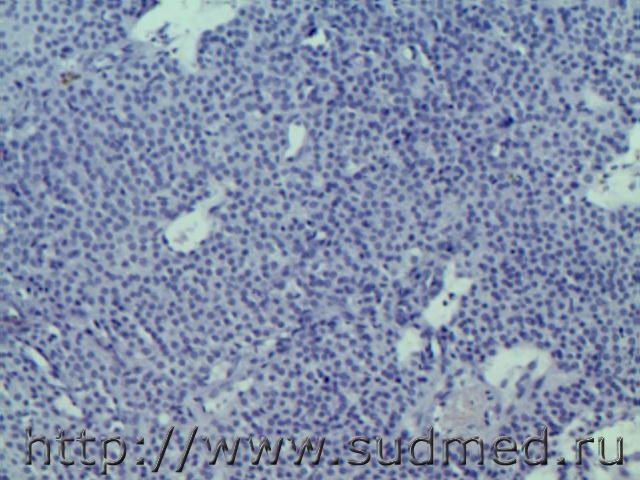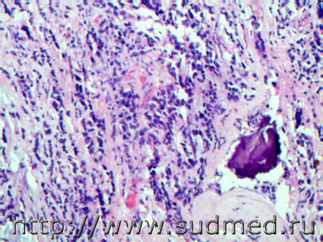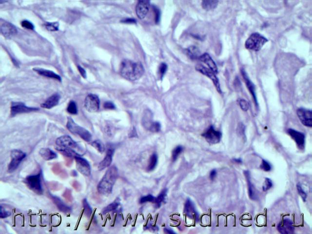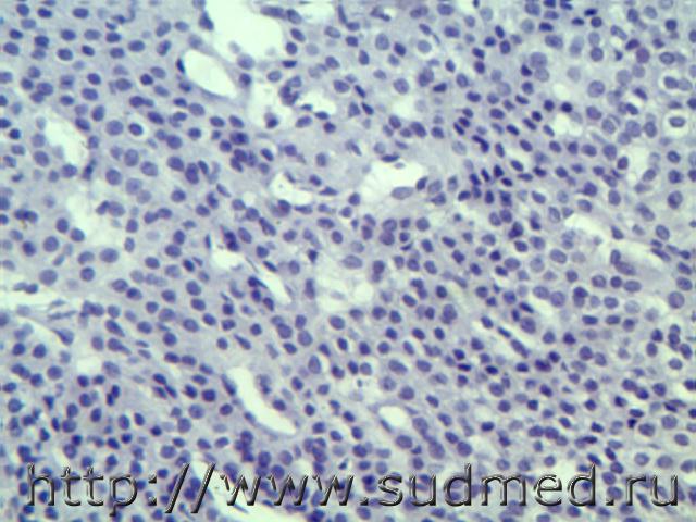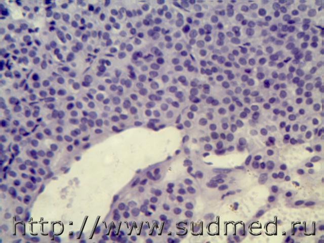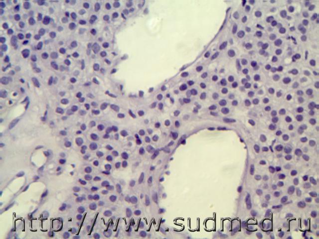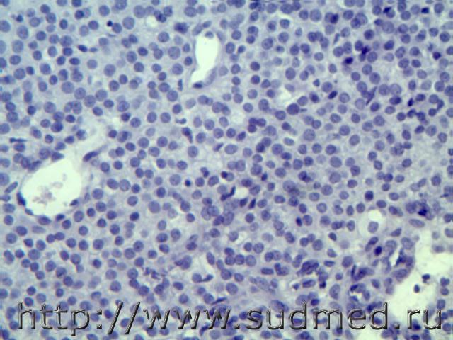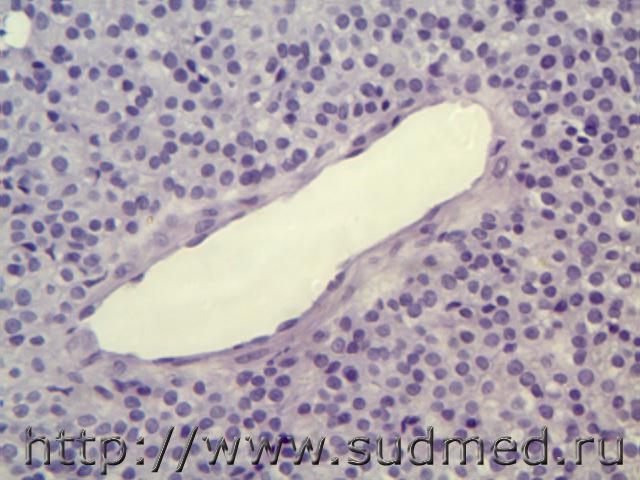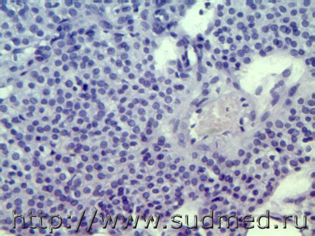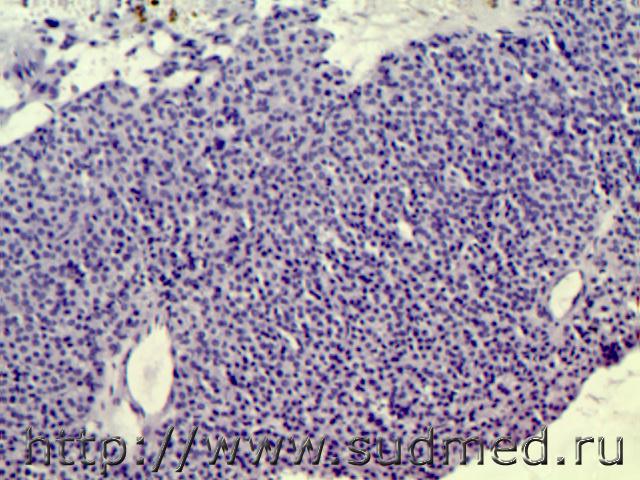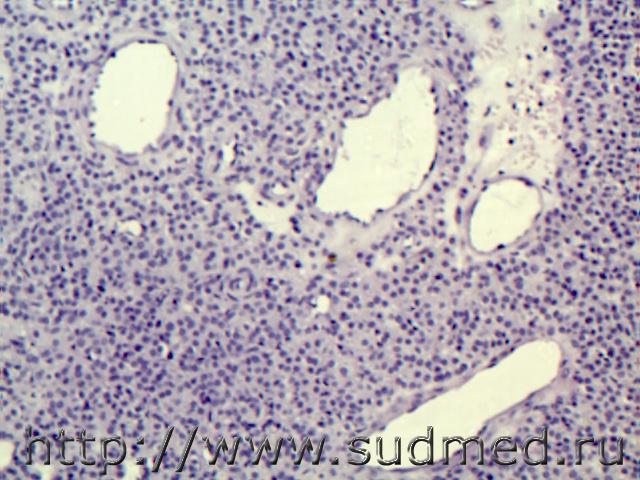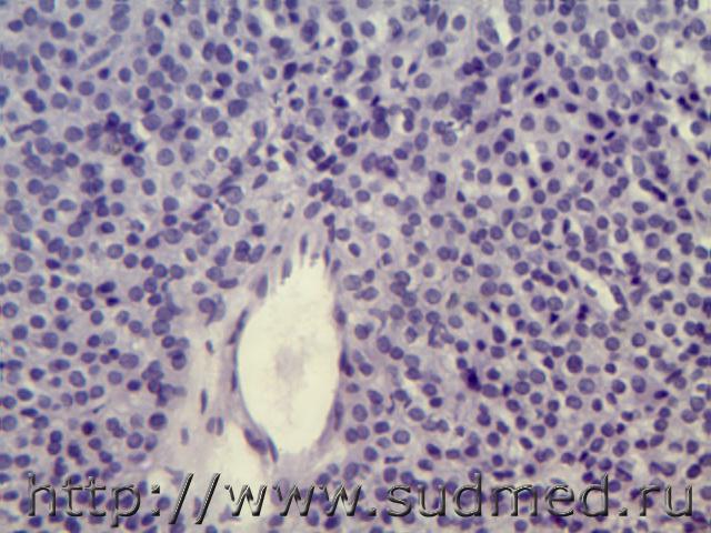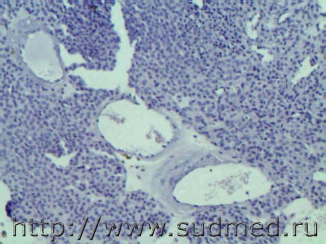 Ж.35лет.Гломусная опухоль кожи пальца( вокруг сосудов массивное расположение гломусных клеток с округлыми темно-синими ядрами).