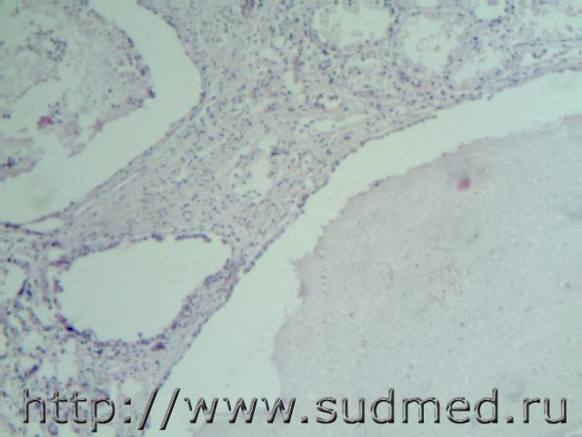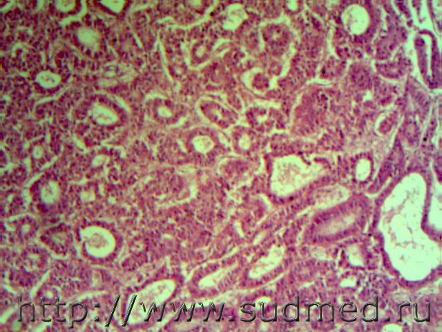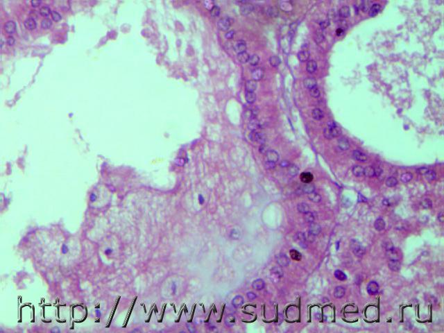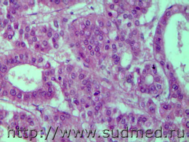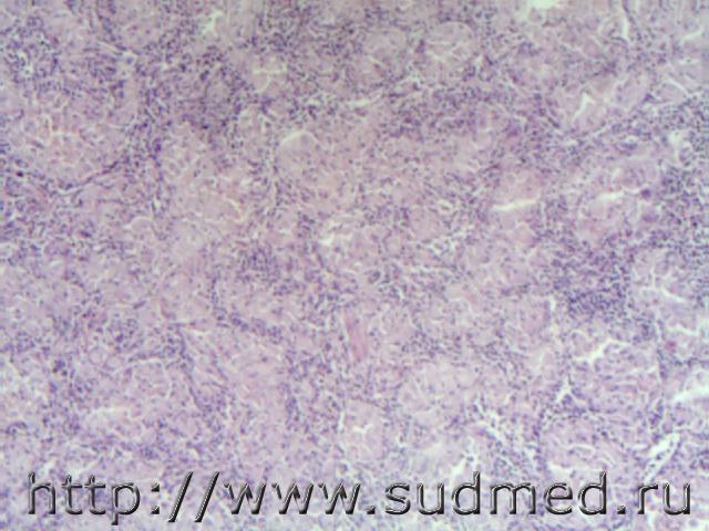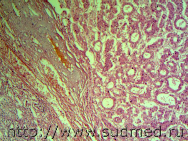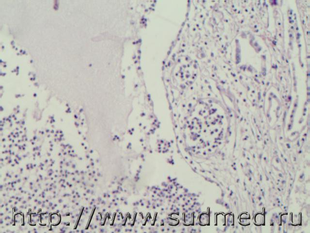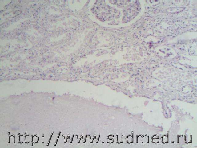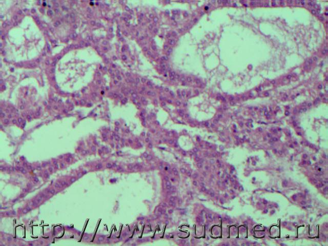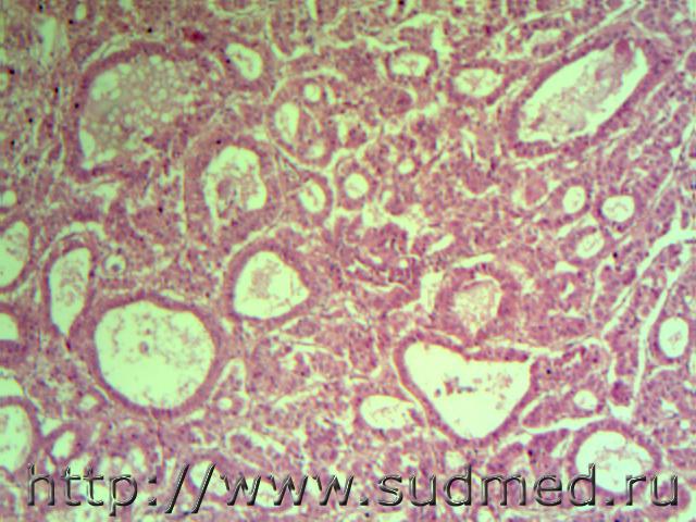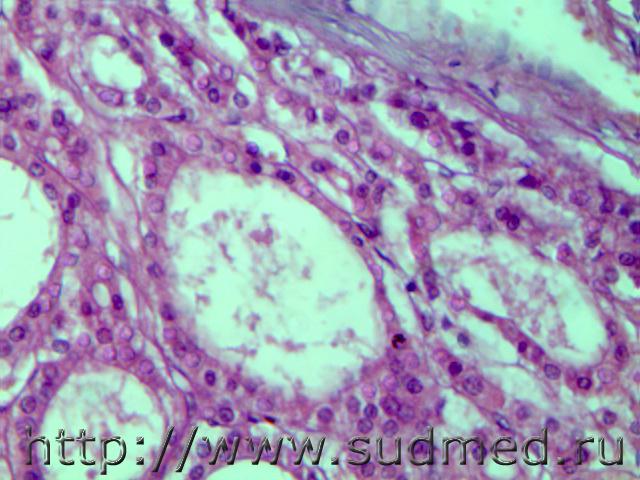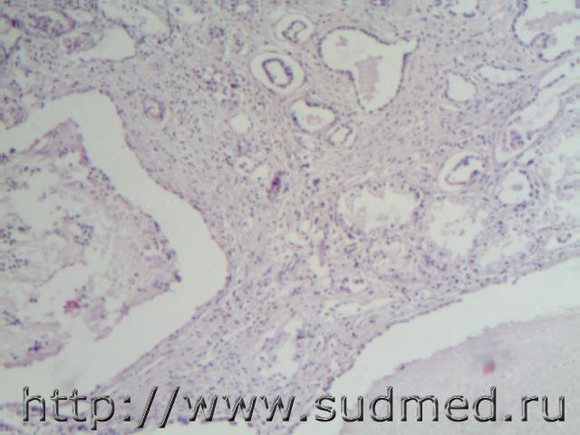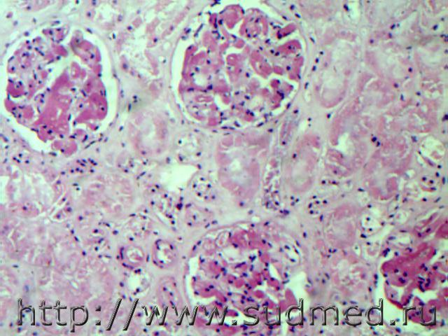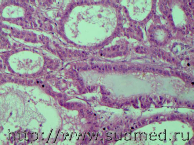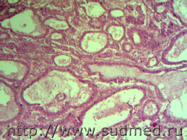 М.64 лет.Поликистоз почки, гнойный нефрит с развитием нагноившейся кисты.( выстилающие кубические эпителии уплощены, в кистозных полостях гомогенная масса, местами видна лейкоцитарная масса).