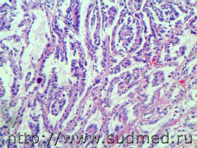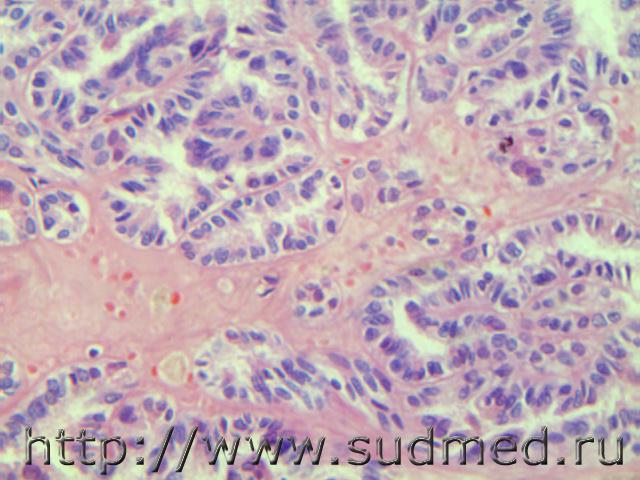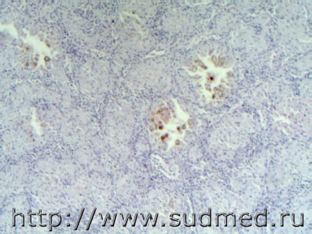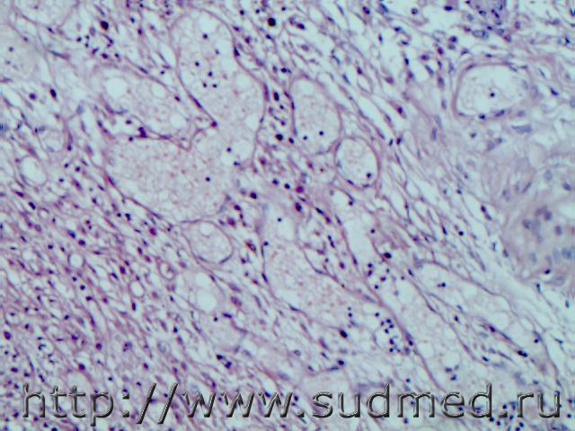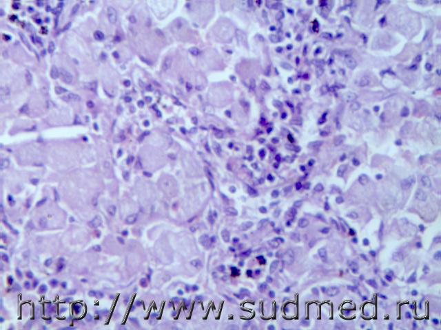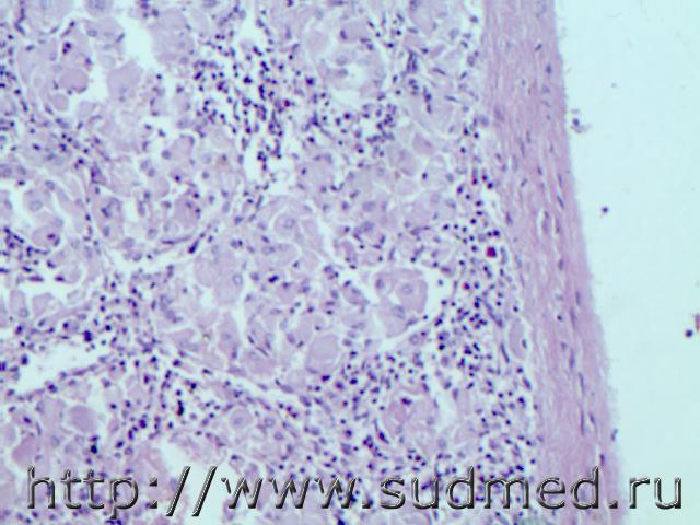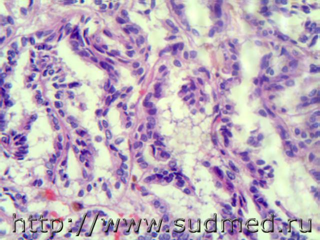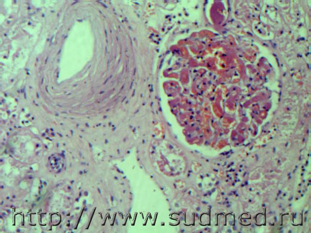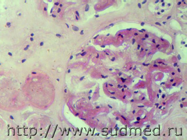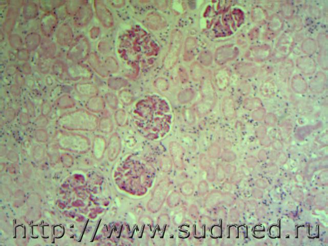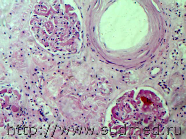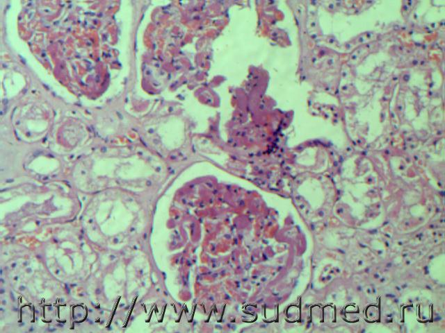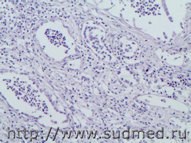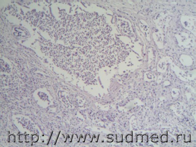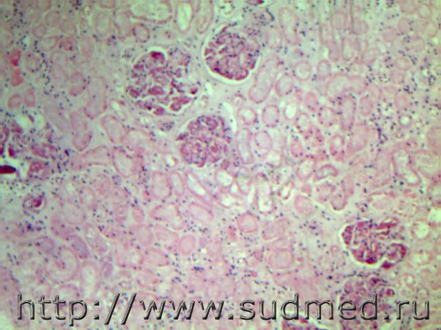 М.64 лет.Поликистоз почки, гнойный нефрит с развитием нагноившейся кисты.( выстилающие кубические эпителии уплощены, в кистозных полостях гомогенная масса, местами видна лейкоцитарная масса).