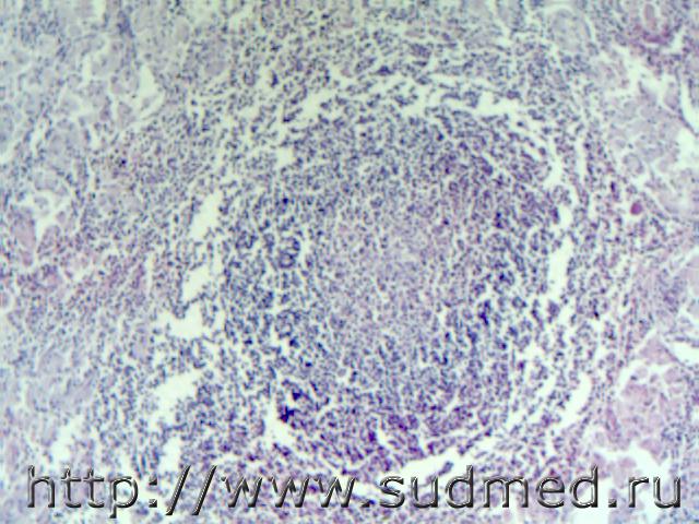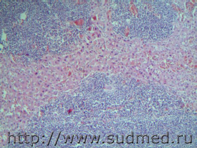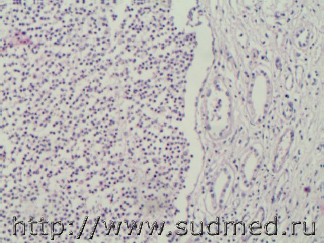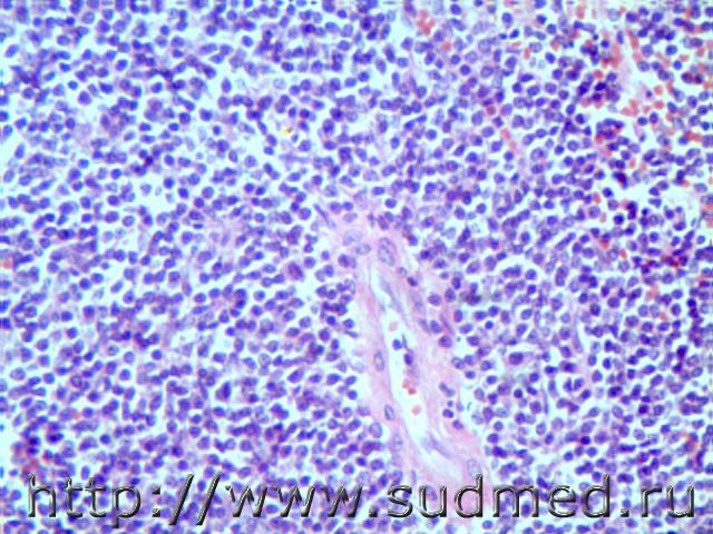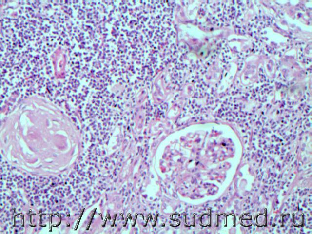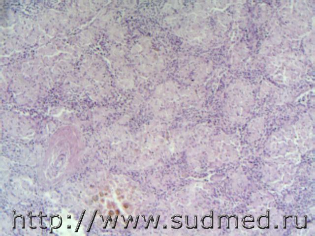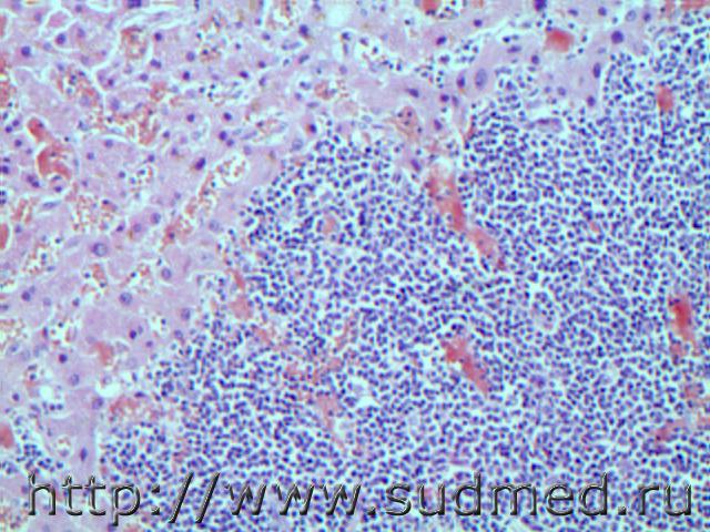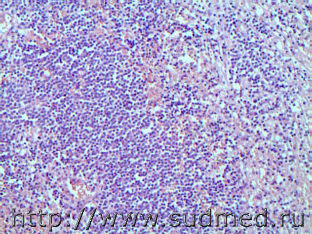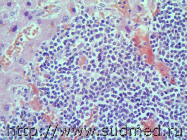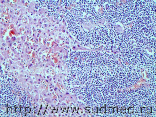 М.80 лет. Хронический лимфолейкоз, криз. Инфильтрация мономорфными малыми лимфоцитами паренхимы селезенки, почки, печени и легких.