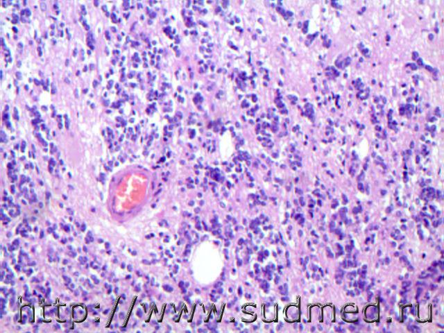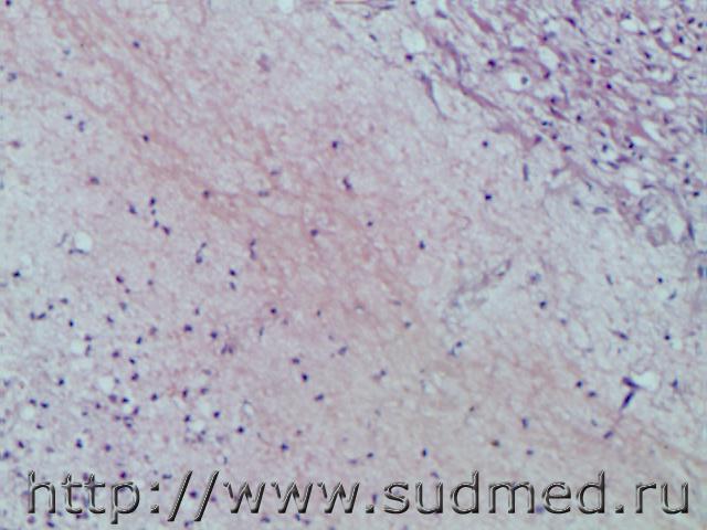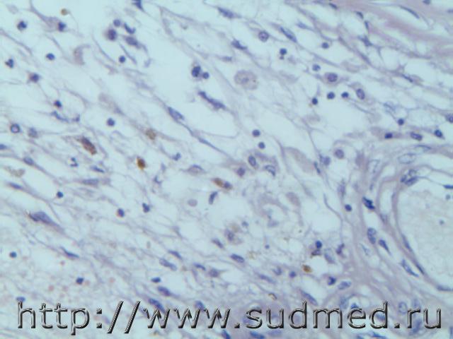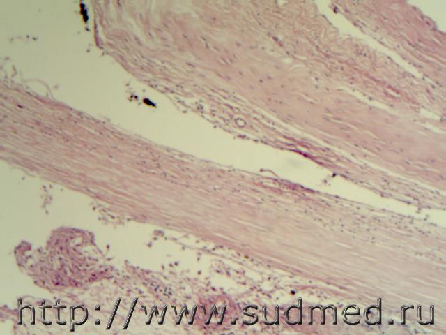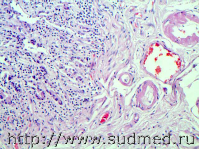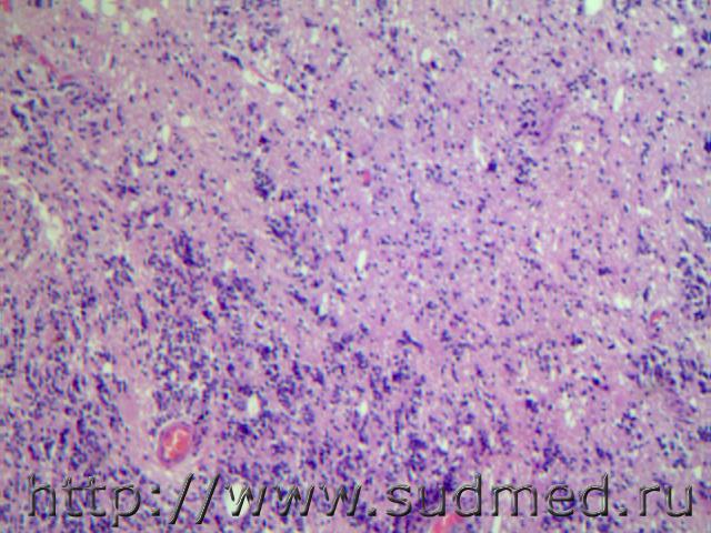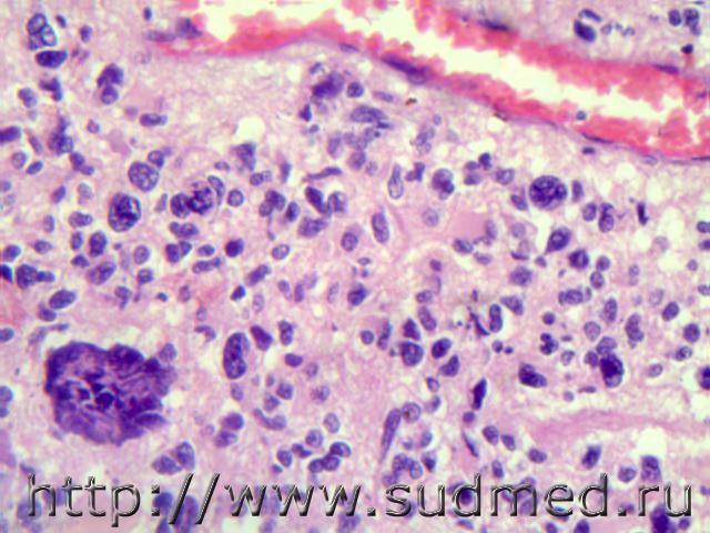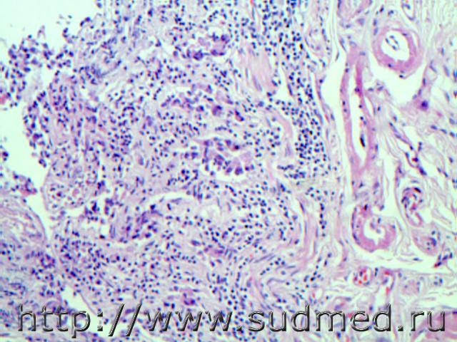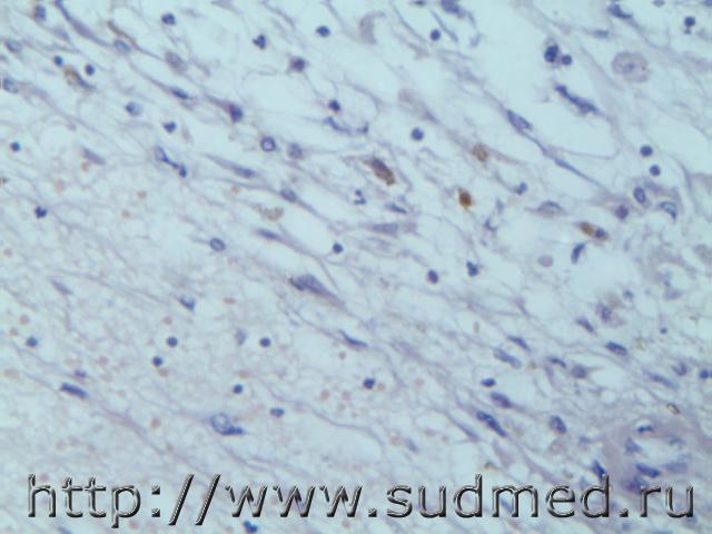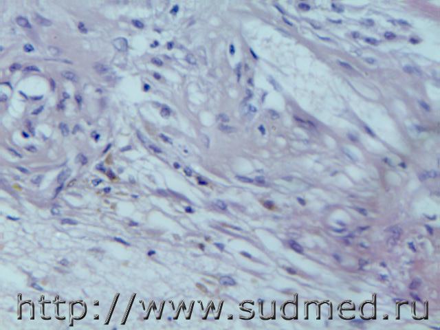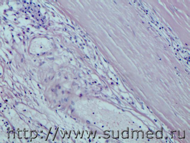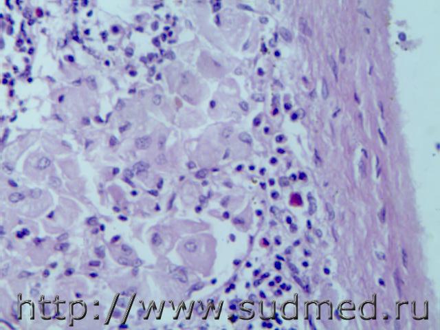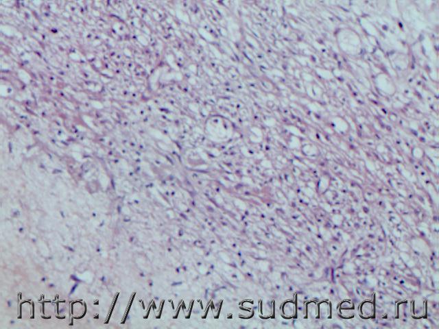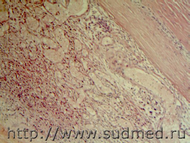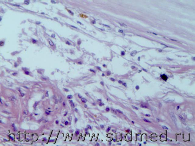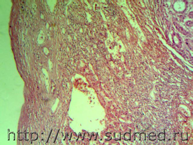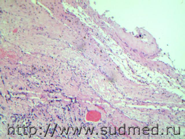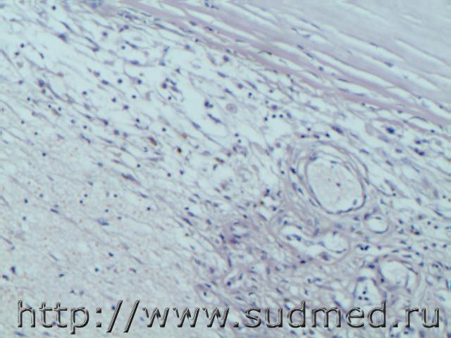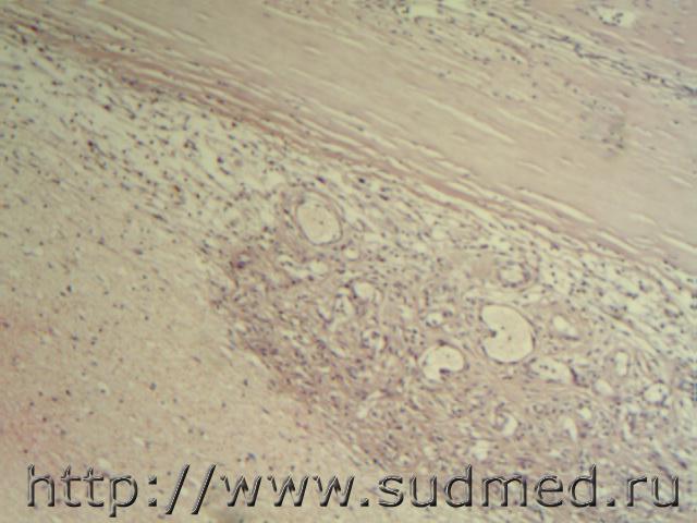 М.35 лет. Субдуральная гематома, стадия резорбции(рассасывания- выраженная сосудистая реакция, вновь образованные капилляры, фибробластные клетки разной степени зрелости, единичные внутри - вне клеточные гемосидерины, ), видно присоединение( вторичного) гнойного менингита.