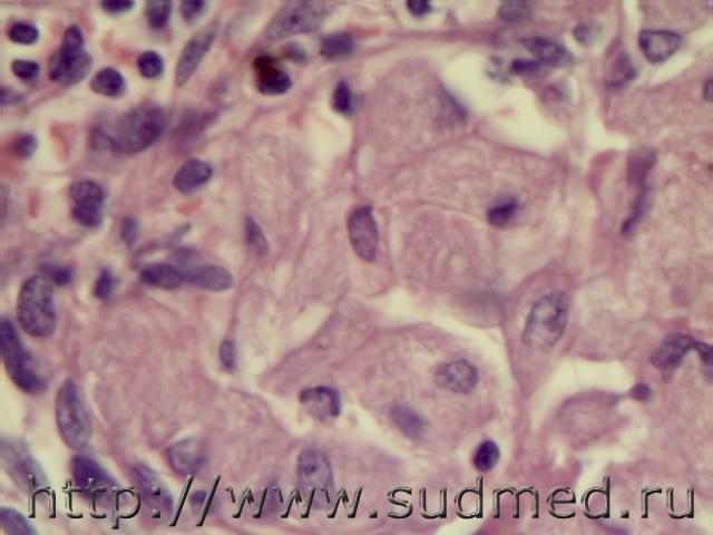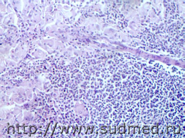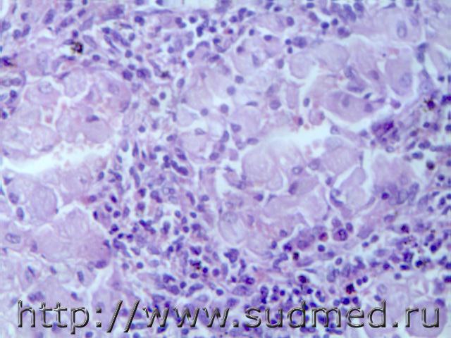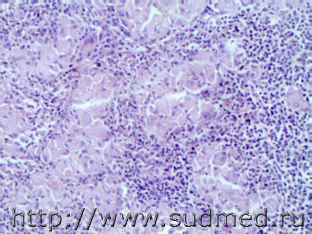 Ребенок, 1.5 годика. Болезнь Гоше. Анализы крови отправлены в Европу, не дожил до результатов. На вскрытии огромная спленомегалия, гепатомегалия(селезенка очажками усеяна клетками гоше- огромные клетки с эксцентричными ядрами, цитоплазма пенисто-глыбчатая, местами имеются несколько ядер).