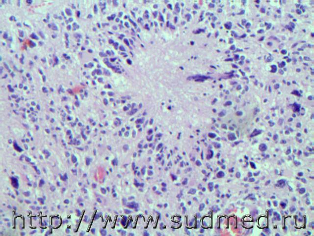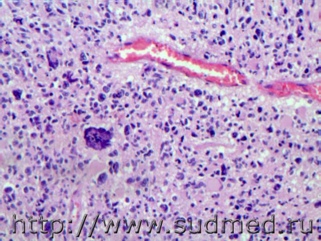 М.48лет. Глиобластома с прорастанием в ТМО в височной области с 12 по 16 фото ТМО с костным микрофрагментом. В 15 фото метастазы в просвете сосуда.