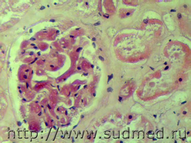 М.47 лет. Фибриноидный некроз и тромбоз капилляров клубочков в виде "проволочной петли" и базальной мембраны канальцев почки при системных заболеваниях. Некронефроз.