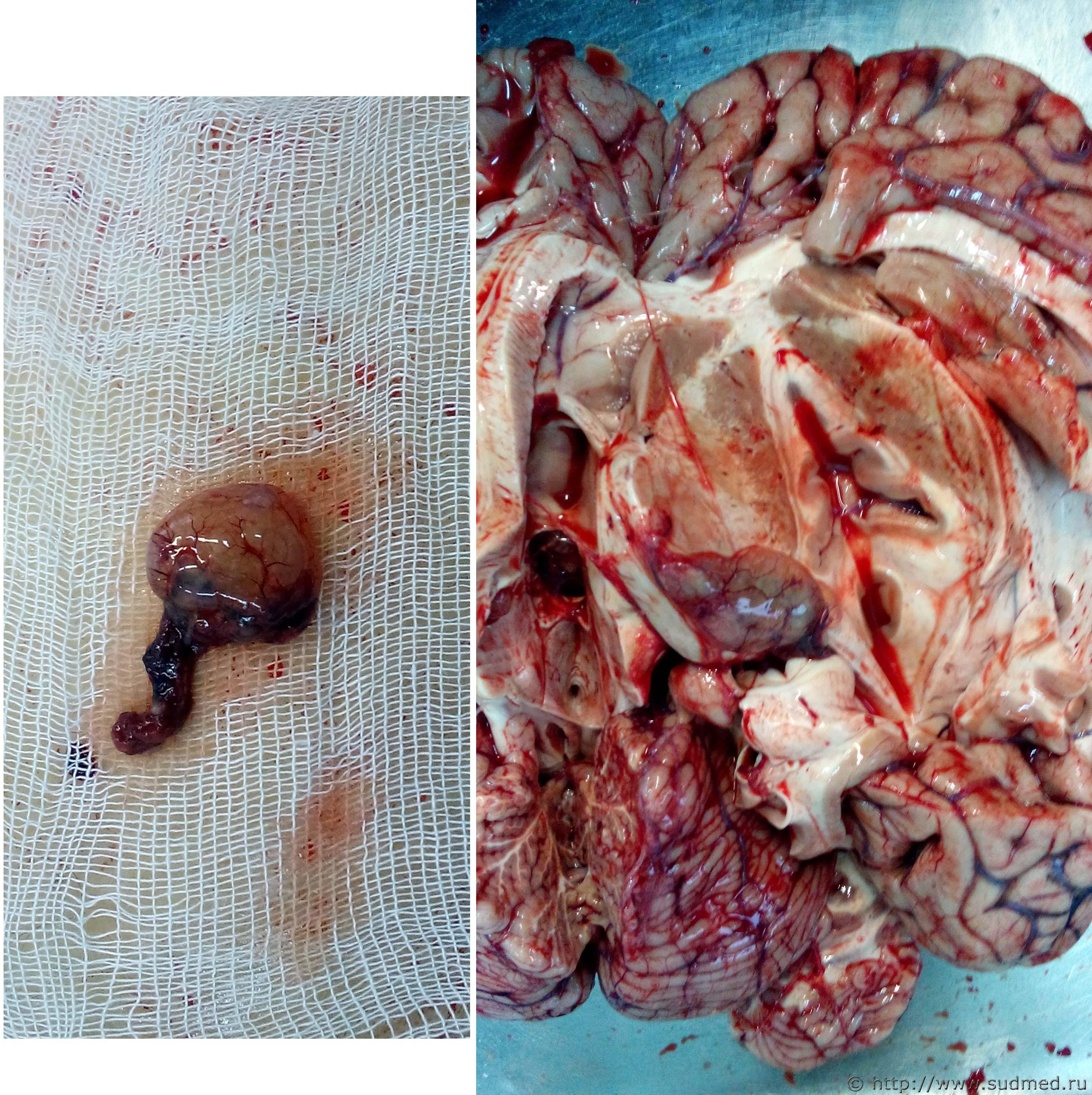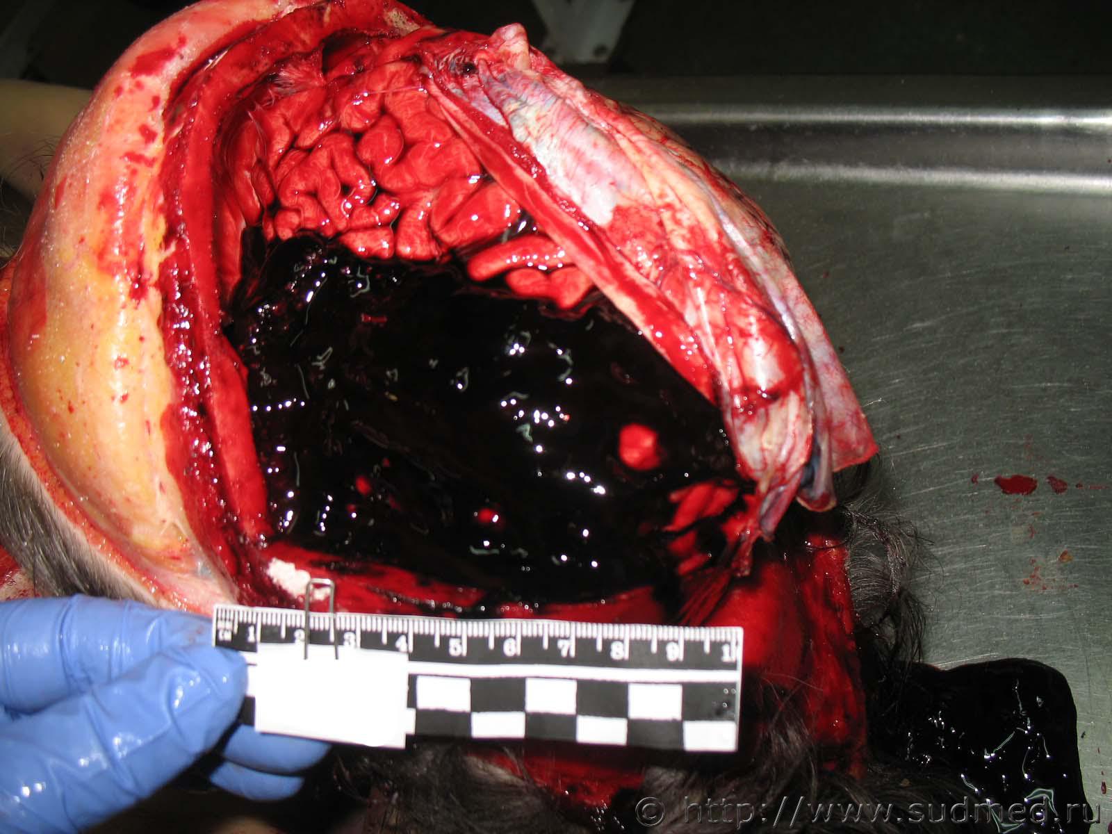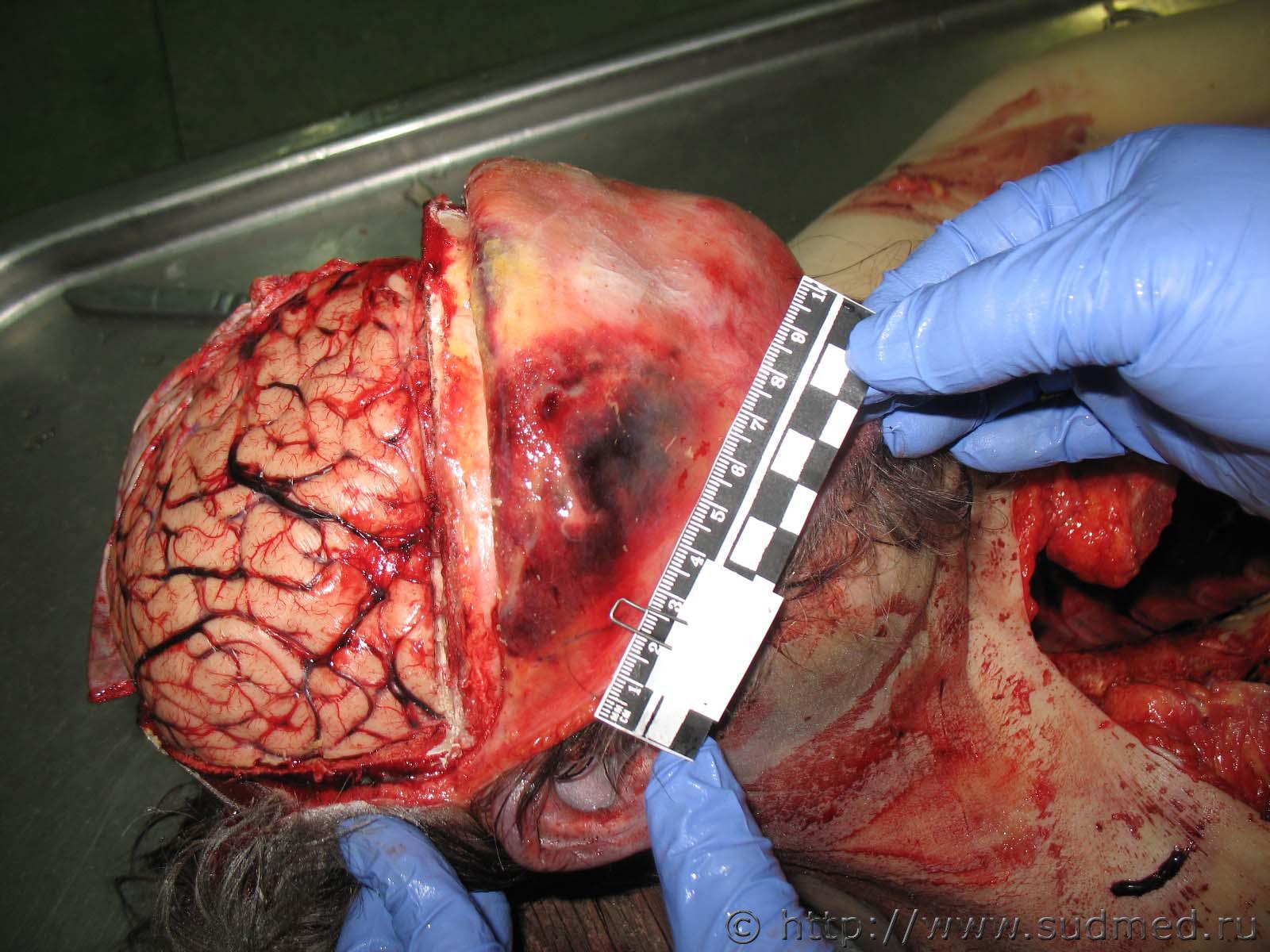 Случай 1: Контактные (ударные) повреждения волосистой части головы и правого большого полушария головного мозга Противоударное внутричерепное повреждение - субдуральная гематома над левым большим полушарием головного мозга Случай 2: Контактное (ударное) повреждение волосистой части головы Внутричерепные контактное (ударное) и противоударные повреждения вещества больших полушарий головного мозга и полушарий мозжечка |