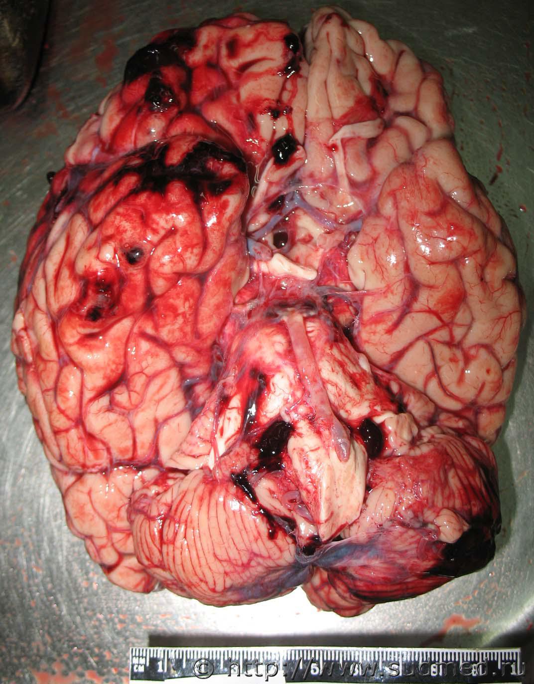 Иллюстрация контактных и противоударных внутричерепных повреждений при ЧМТ ускорения.