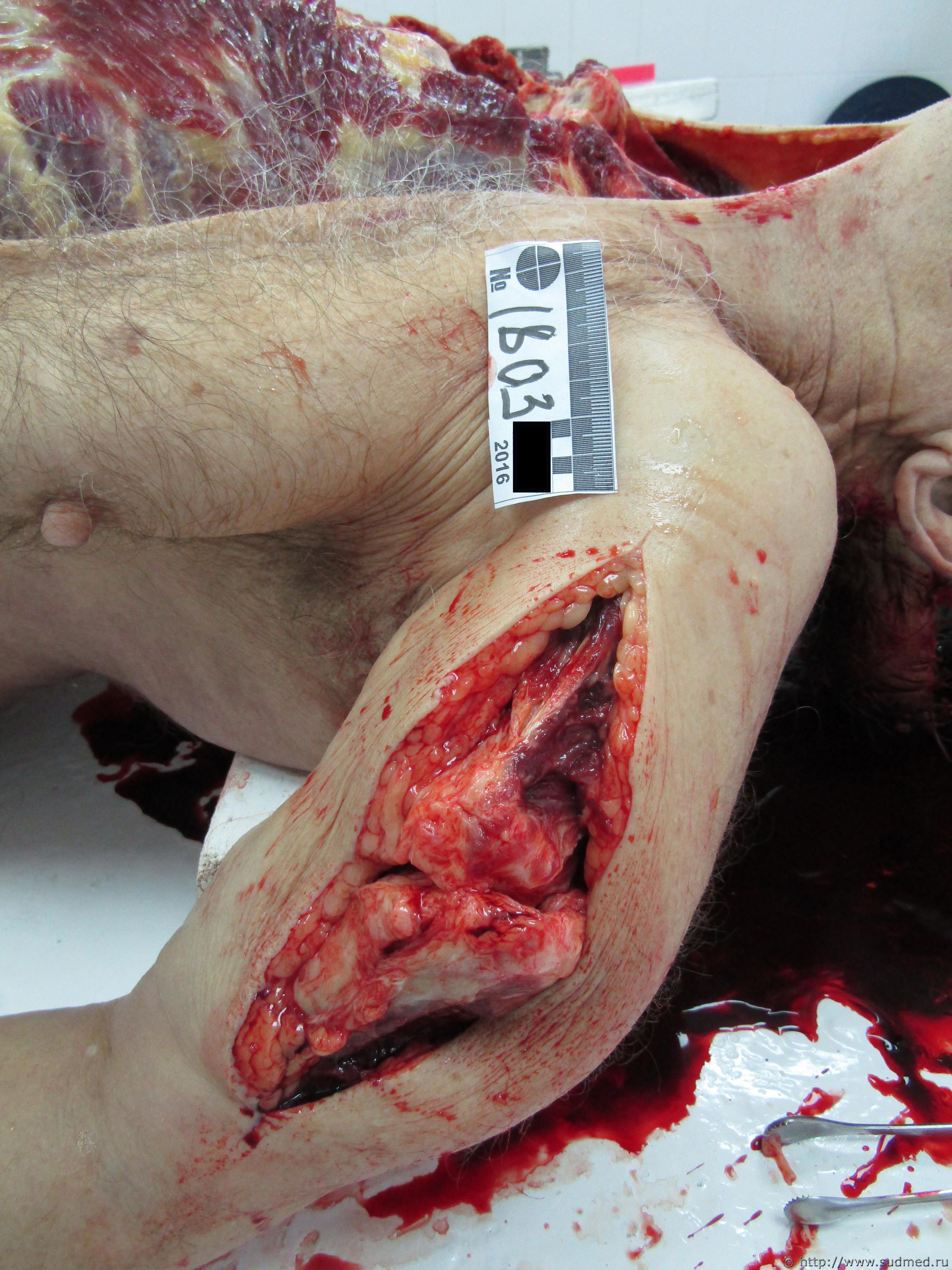 Взрывная травма. Неблизкая дистанция взрыва. Самодельное безоболочечное ВУ, снабженное множественными специальными поражающими элементами механического действия - металлическими шариками, диаметром 1,8-2 см.