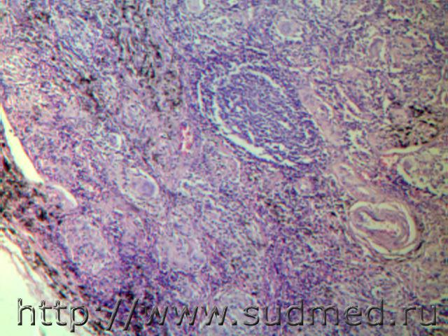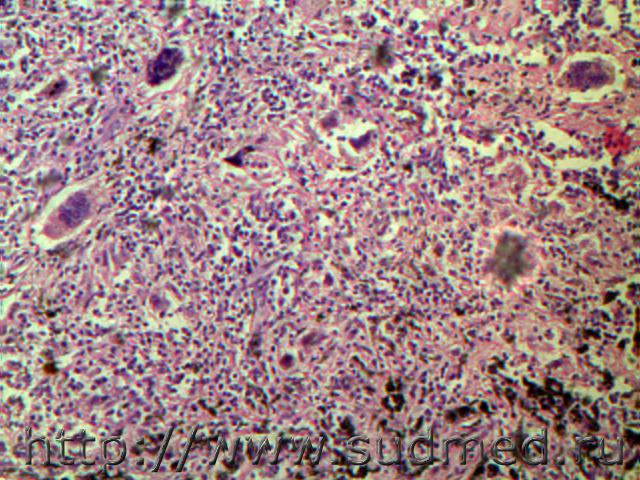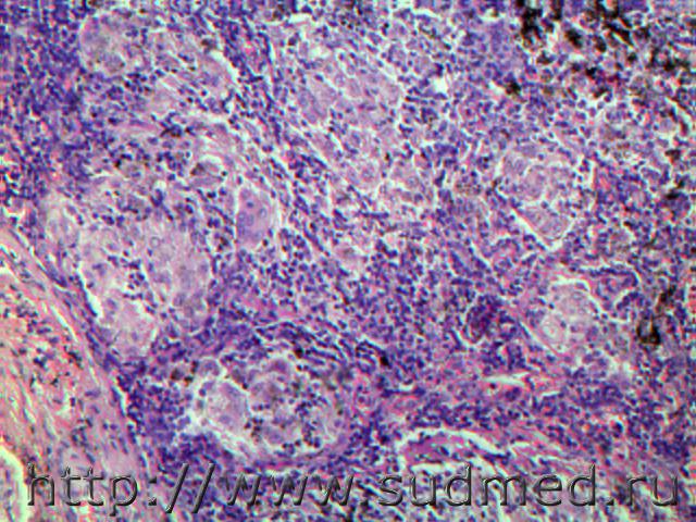 Ж.56 лет. Трансторакальная видеобиопсия бифуркационного лимфатического узла.По гистокартине ввиду отсутствия казеозного некроза, разной формы штампованностью гранулем с отложением эозинофилно-гиалиноподобной массы, наличием многоядерных гигантских клеток по типу инородных тел,выраженной склеротической стромой с угольным пигментом и периартеритом был выставлен - Саркоидозная гранулема л/у легких.