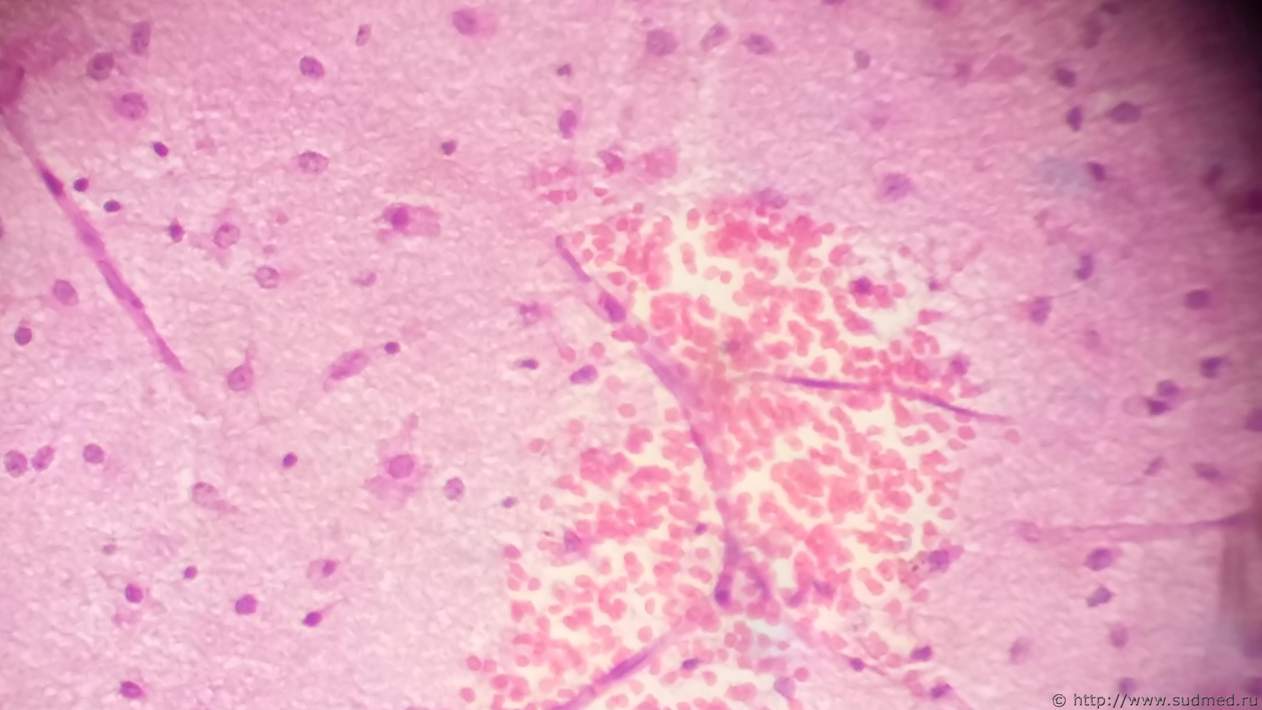 Новорожденный , жил 3 дня. После родов получил травму головы в неизвестных обстоятельствах. Ушиб головного мозга. В мягкой ткани головы затылочно-теменной области кровоподтеки 3х4см. Осложнение ДВС-синдром . Кровоизлияние в головном мозге, геморрагии в алвеолах с аспирацией в просвет бронхов.