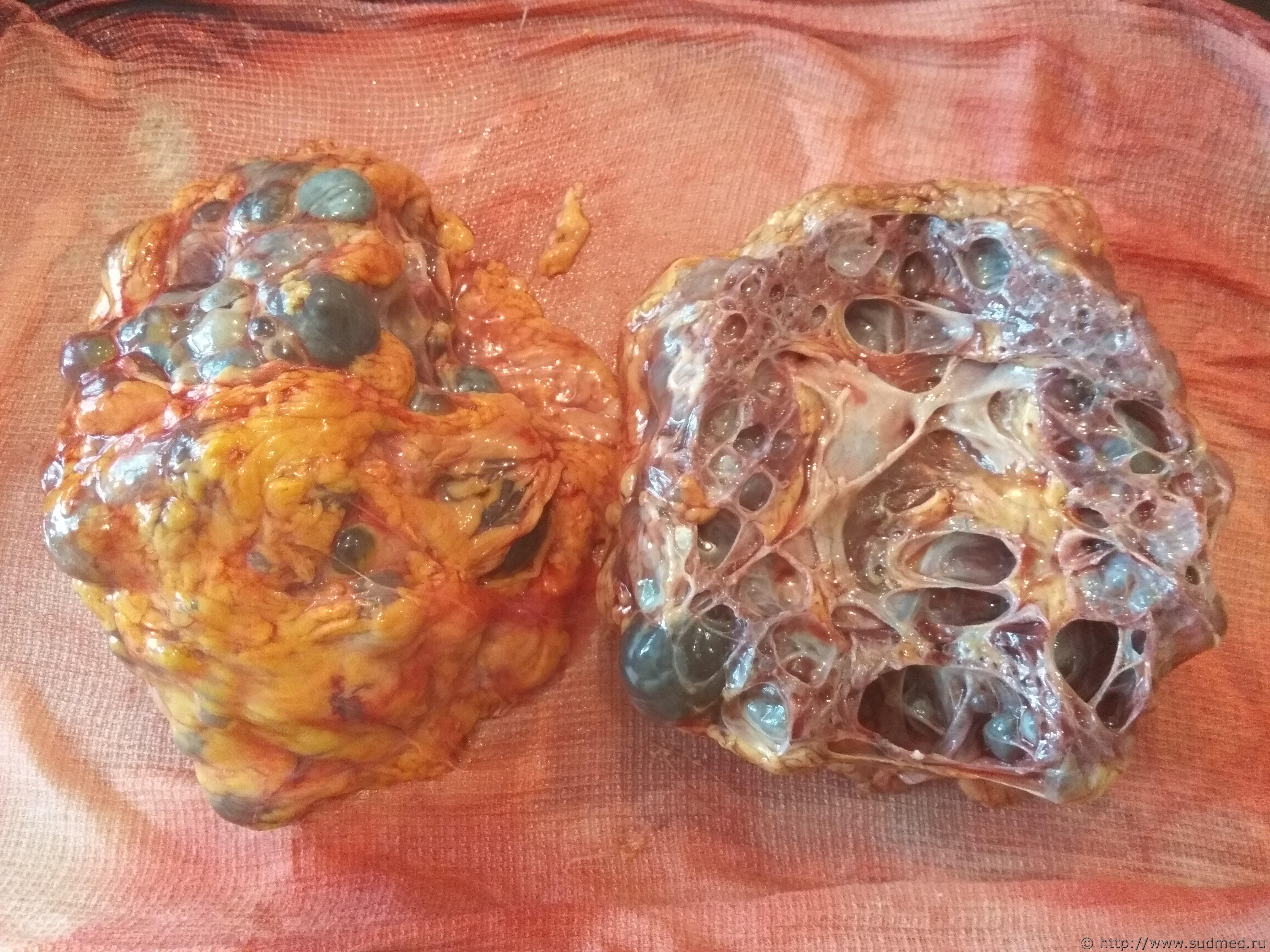 Женщина приблизительно 30 лет потеряла сознание дома. Она была доставлена в больницу скорой помощью - остановка сердца и дыхания. Ростом 172 см и 146 кг. Подкожное кровоизлияние диаметром 4,5 см наблюдалось в эпигастральной области. Левый яичник был заметно опухшим, а общий вес матки и правого яичника составлял более 13,0 кг. Была обнаружена левая яичниковая опухоль, состоящая из серозных и муцинозных кист. Не было метастазы других органах. Причиной смерти считается нарушение кровообращения - асцит и опухоль цистаденома яичника. ![]() ![]() ![]() ![]() ![]() |