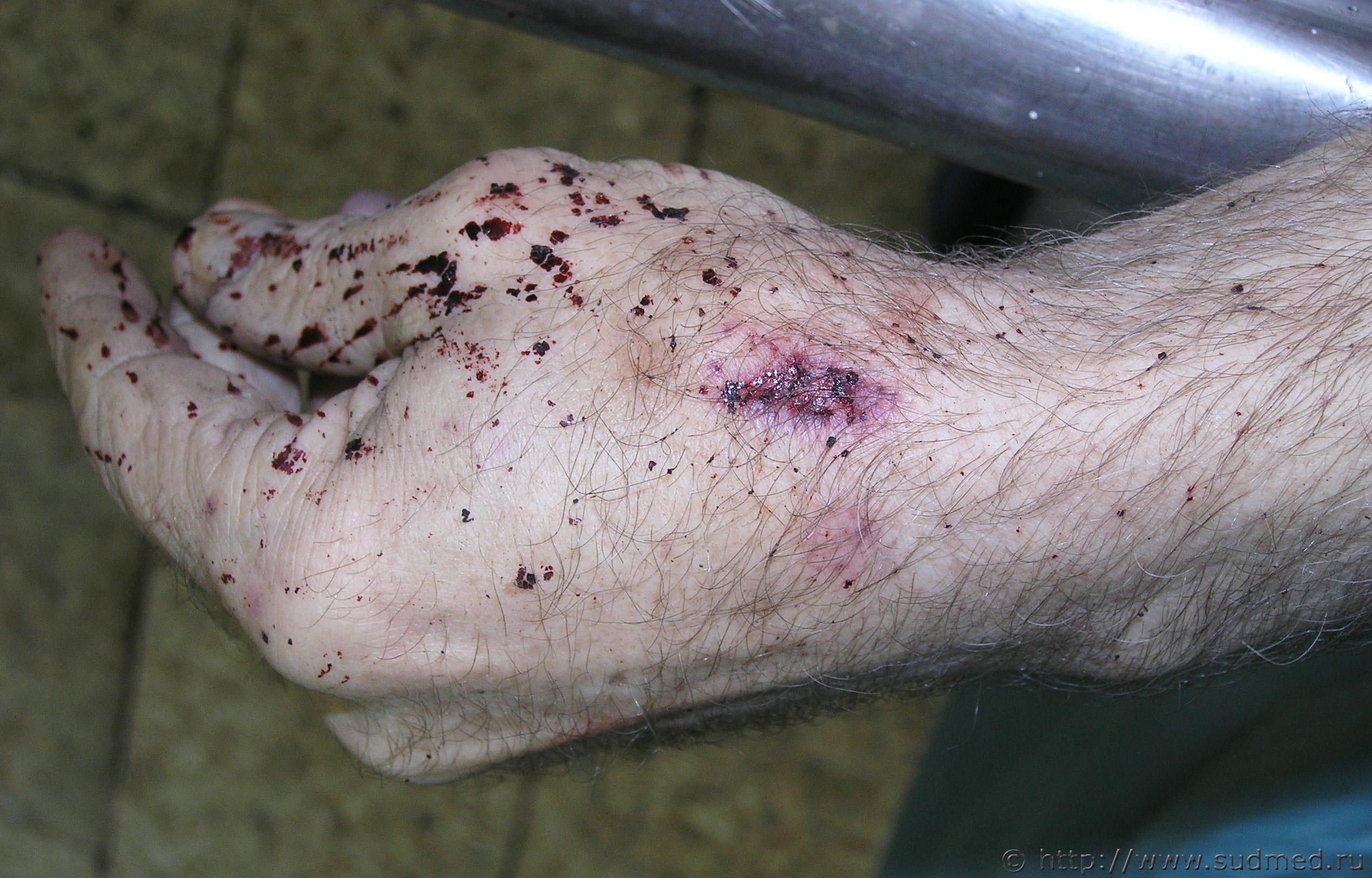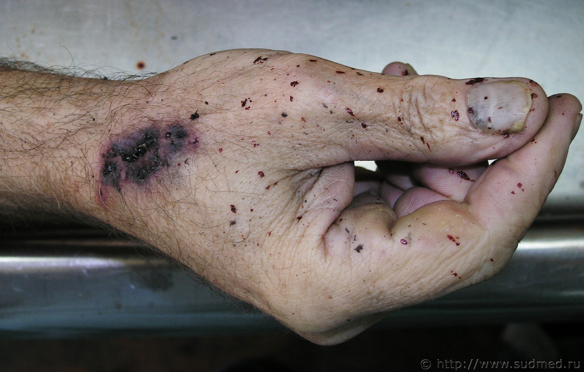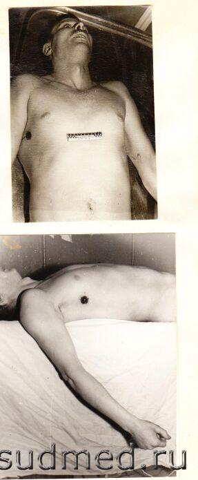 На память, по крайней мере, ничего не приходит. При проведении экспертизы огнестрельных повреждений бывает важно установить - в каком положении находился пострадавший в момент выстрела. Этот вопрос включает в себя и взаиморасположение частей тела, в частности, туловища и конечностей (обычно - рук). Перебирая архив вспомнил давний анализ, проведенный при огнестрельном дробовом ранении при выстреле плотного упора и смертью на МП (разрушение правого легкого, массивное внутреннее кровотечение. При исследовании трупа была обнаружена типичная огнестрельная рана по подмышечной линии. Рана была перекрыта сохранившимися мышцами. При манипуляциях с правой рукой удалось добиться положения руки (показано на фотографии), при котором раневый канал мышцами уже не перекрывался и был полностью открыт вплоть до плевральной полости. Это позволило прийти к выводу о положении правого плеча в момент выстрела ( которое совпадала с показаниями обвиняемого - пострадавший был обращен правым боком к нему и схватив ствол ружья приставил его к телу с криком "Стреляй..."). Эскизы прикрепленных изображений |
