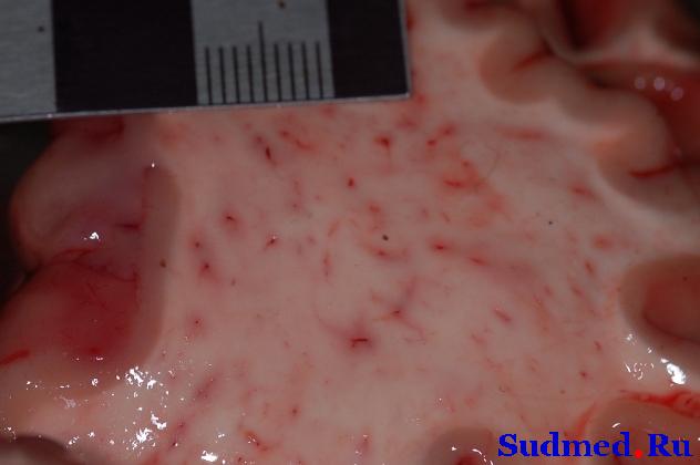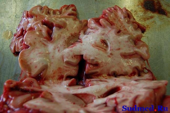 Мужчина, 43 лет, довольно тучный, скоропостижно скончался по месту жительства. Из направления милиции: "скончался после укуса насекомыми...". Со слов родственницы, получавшей свидетельство о смерти, которая не была очевидицей происшедшего и знает всю "историию" со слов супруги покойного, пострадавший находился на дворе дачи, возился в зарослях, когда его укусила оса куда-то "пониже плеча". Практически сразу ему стало плохо, его отвели под руки в дом. Когда завели в комнату, он практически падал. Вызвали скорую помощь, которая приехала минут через 30-40. В течение этого периода времени пострадавшему совсем поплохело, он потерял сознание, отмечалось хриплое дыхание. Его пытались "реанимировать", вытаскивали язык, пытались делать искусственное дыхание. Прибывшая СП констатировала наступление смерти, но под давление родственников врач сделал п/к инъекцию адреналина. На вскрытии - разлитые трупные пятна, на лице и на правой верхней конечности кое-где - внутрикожные кровоизлияния (см. фото). В белом веществе головного мозга, преимущественно в лобных долях - множественные мелкоочаговые крвооизлияния (см. фото). Масса мозга - 1610 г. Правая рука отечна (окружность плеча и предплечья на 2 см больше, чем слева). Явных следов укусов не обнаружено. Да и еще, неделю назад его вроде бы кусал клещ в ту же руку, где-то в область подмышки. Бывало ли у кого-нть что-либо подобное в практике? Эскизы прикрепленных изображений |