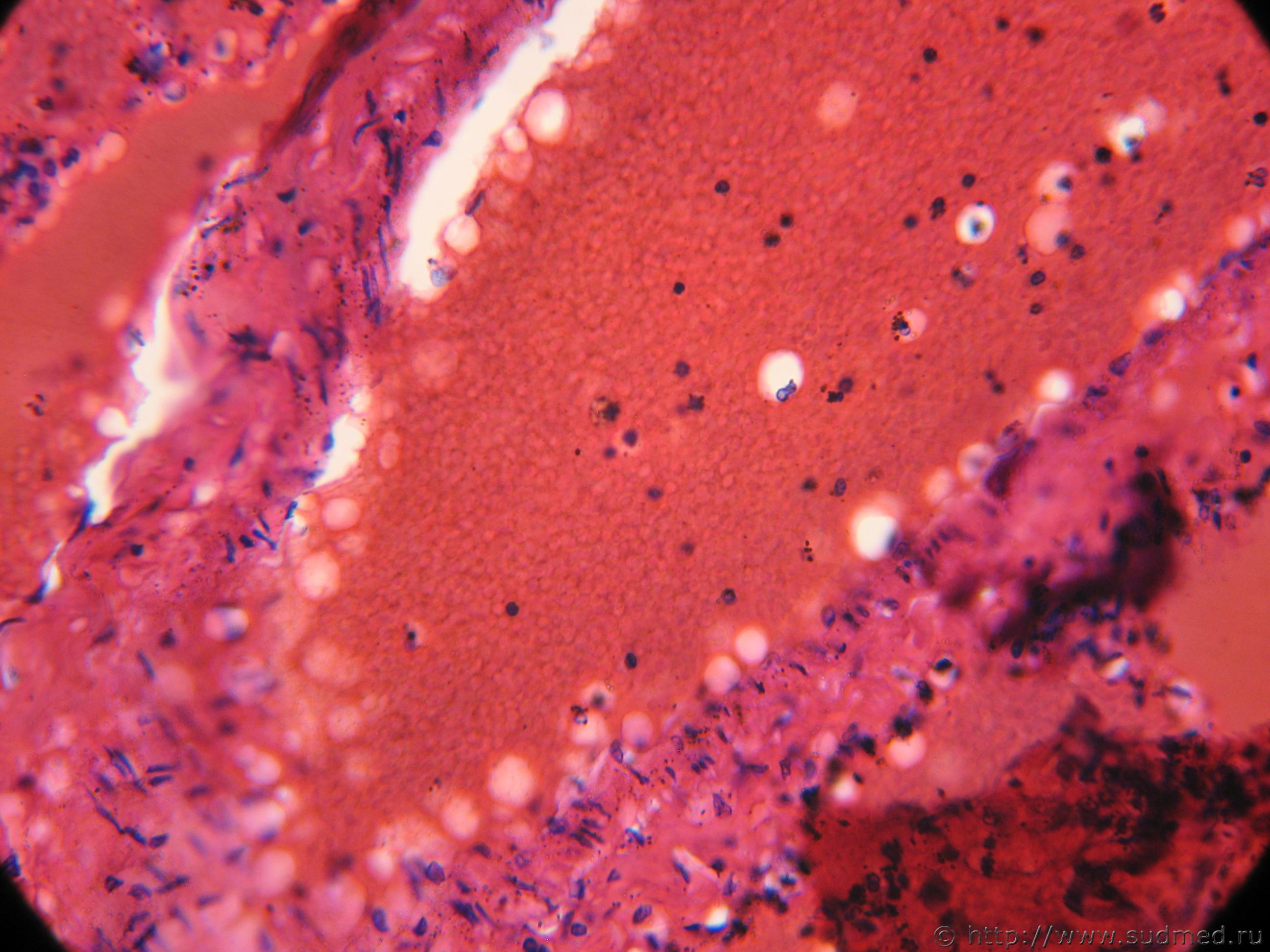 ...Всегда считала это нач.гнил.изменениями, т.к. эритроциты частично гемолизированными были всегда... Развеян очередной "патогномоничный признак" Гипостаз в легком, случай после пожара, д-з "отравление СО". Особенно часто такую же картину можно наблюдать у "алкоголиков" с быстро развившимися гнилостными изменениями. Ладно, это одна сторона вопроса, а как быть с "аэротромбами","... которые имеют вид полостей, окруженных выпавшими нитями фибрина, склеенных эритроцитов с большим или меньшим количеством клеток белой крови" (В.Г.Науменко, Н.А.Митяева "Гист. и цит. методы..." стр.147) PS Поход в билиотеку временно откладывается, в связи с посадкой паслёновых |