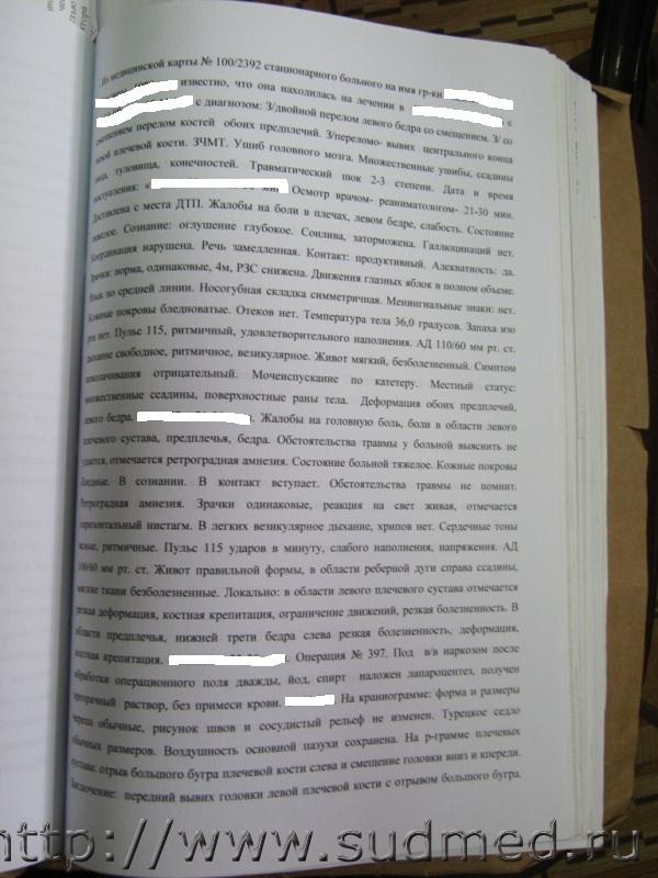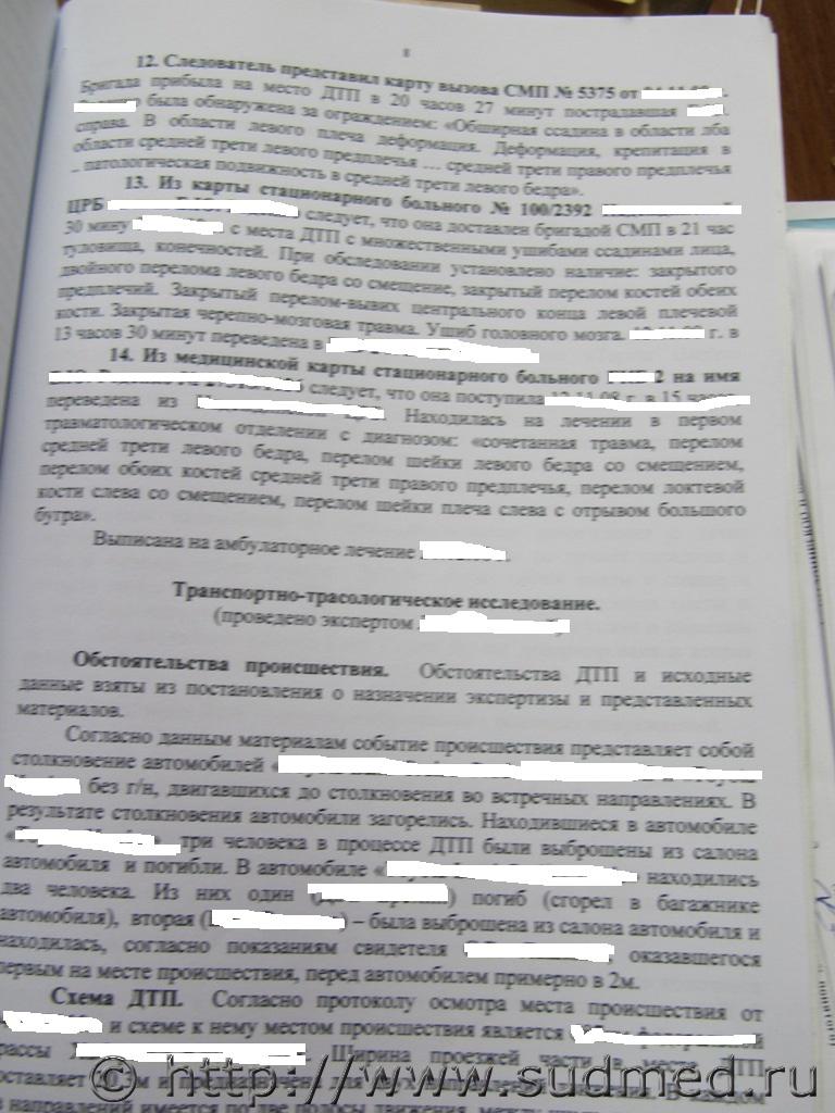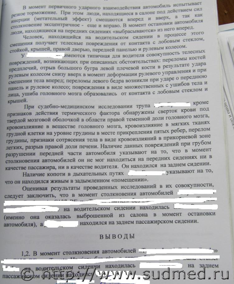 Стала участником ДТП, в результате которого, единственным выжившим человеком являюсь я. Вывод судебно-медицинской экспертизы однозначен: я находилась за рулём автомобиля. Но это не так. Я точно знаю, что была пассажиром, есть свидетели, подтверждающие это. На основании вывода эксперта мне выдвигают обвинение. Вывод эксперта: «У.... имеется типичная для водителя совокупность телесных повреждений, возникающих при описанных обстоятельствах: переломы костей предплечий, отрыв большого бугра левой плечевой кости в результате удара рулевым колесом снизу вверх в момент деформации рулевого управления и при смещении тела вперед; переломы левого бедра возникли при ударе о переднюю панель и рулевое колесо; повреждения в виде множественных ушибов тела и лица. Ушибы головного мозга образовались от контакта с лобовым стекло и крышей.» Дополнительная информация: Лобовое столкновение машин при совокупной скорости более 200 км/ч. Меня обнаружили, по словам человека, который меня и нашел, за 7-10 метров от машины. Травм грудной клетки, позвоночного столба – нет, сотрясение мозга расценивается как легкое. Травм, разрывов, повреждений внутренних органов – нет. Переломы все со смещением. Скажите, пожалуйста, можно ли на основании моих переломов сделать однозначный вывод о том, что водителем являлась я? Какая вероятность того, что при такой скорости, «вылететь» из праворукой машины, находясь за рулём, не повредив при этом грудной клетки? (у второго человека, который в машине, «поперечный перелом грудной клетки на уровне 5-го ребра», но его нашли в багажнике автомобиля). Я понимаю, что это вопрос не к судебной медицине, но как часто на вашей практике, человек, который был за рулем и не имел травм грудной клетки? Какова вероятность? Пожалуйста, помогите, понять насколько прав эксперт в своем заключении. Готова выслать/написать здесь все необходимые для уточнения. |