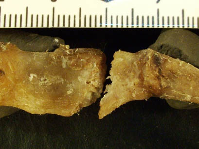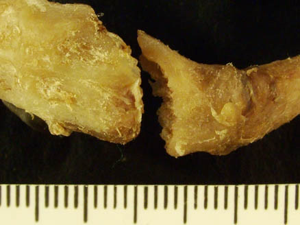 Уверен, уважаемый for-tula, что Вы опытный эксперт и исключили артефакт со стороны санитара. Попробуйте тогда "поковыряться" иголочкой на поверхности излома - должна быть выраженная порозность... Как казуистика - саркома. Хотелось бы видеть и другие фото С уважением |