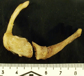 FILINу – дополнительная соединительная ткань в области сочленения в глаза не бросилась, даже во время удаления м/т. Вариант перелома при извлечении очень хорош, как совпадающий по механизму образования. Но выделял ведь сам, вроде как всегда, да и хрустнуло бы в руках. Конечно казуистика так и рождается (по Попову) делаю все обычно, ничего не насторожило, а в результате – загадка. Я первоначально долго искал ответ на предположение, а может мышцы языка как-то напряглись, да сломали кость (по аналогии с переломами боковых отростков поясничных позвонков), но потом решил, что и масса мышц не та, да антагонизм из не выражен. Krimу и ЙЦУКену – рентгена нет ни с мягкими, ни с жесткими лучами. Гистологи наверняка откажут из-за проблем с декальцинацией. SBZ – у нас санитар только пилит голову и зашивает тело. Прочность костной ткани не пробовал, но обязательно попробую, но когда чистил кость надкостница плотная. Досылаю фото. Эскизы прикрепленных изображений ![]() ![]() |