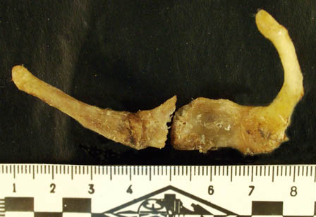 Уважаемые коллеги! В ходе исследования трупа обнаружил перелом подъязычной кости, об который «всю голову сломал». Чуть подробнее вводная часть: М-46 лет, причина смерти колото-резаное ранение подколенной области с полным пересечением большеберцовой артерии. В ходе исследования обнаружена аномальная подвижность тела подъязычной кости, поэтому комплекс подъязычная кость и хрящи гортани изъяты для дополнительного исследования. На коже, в толще кожи и подкожножировом слое при циркулярном исследовании повреждений и кровоизлияний нет. Есть кровоизлияние в м/т прилежащие к перелому на толщину не более 0,6 см, которое немного распространяется вниз до верхнего края пластинки щитовидного хряща. Ни в окружности сосудов шеи, ни в связках шейного отдела позвоночника, ни в мышцы языка кровоизлияний нет. Гистологически выявлены кровоизлияния с начальной реактивной реакцией (свежие эритроциты с единичными лейкоцитами). В МКО после очистки выявлен изолированный перелом тела подъязычной кости слева, причем левый сустав имеет физиологическую подвижность, а справа неподвижный. Признаки сжатия на внутренней поверхности, растяжения на передней… (На обзорном фото вид спереди и изнутри. Если интересны детали краев есть и они).