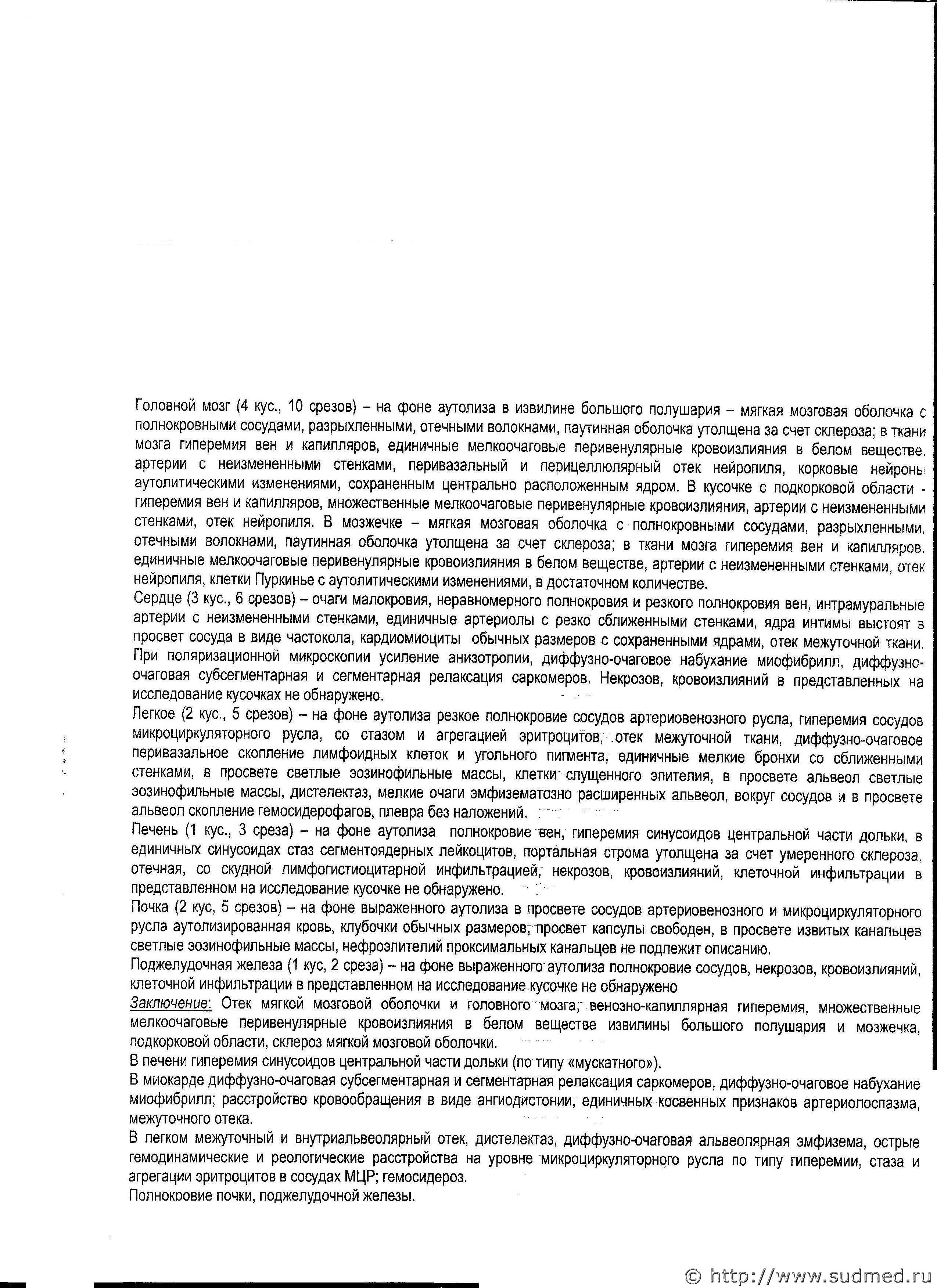 Цитата Сердечная сорочка цела,в её полости следы прозрачной жидкости. Сердце конусовидной формы размером 13,5х11х6см.масса сердца 310г Толщина мышцы левого желудочка 1,2 см, правого-0,2 см. .На разрезе полости его не расширены,в них темно-красная жидкая кровь.Клапаны сердца и крупных сосудов подвижные , тонкие.Сосочковые и трабекулярные мышцы не утолщены, сухожильные нити не укорочены. Мышца сердца на разрезе серовато-красного цвета, без прослоек фиброзной ткани .Периметр митрального клапана 9см, трикуспидального - 10,5 см, периметр аорты на уровне клапанов 6,5 см, периметр легочной артерии 8 см.Тип кровоснабжения сердца правосторонний . Венечные сосуды проходят поверхностно,по ходу умеренно обложены жиром,на разрезе проходимы на всем протяжении,стенка их тонкая рост 175см, питание удовлетворительное, чуть ближе к повышенному( не взвешивался ) . Кровь из полости черепа |