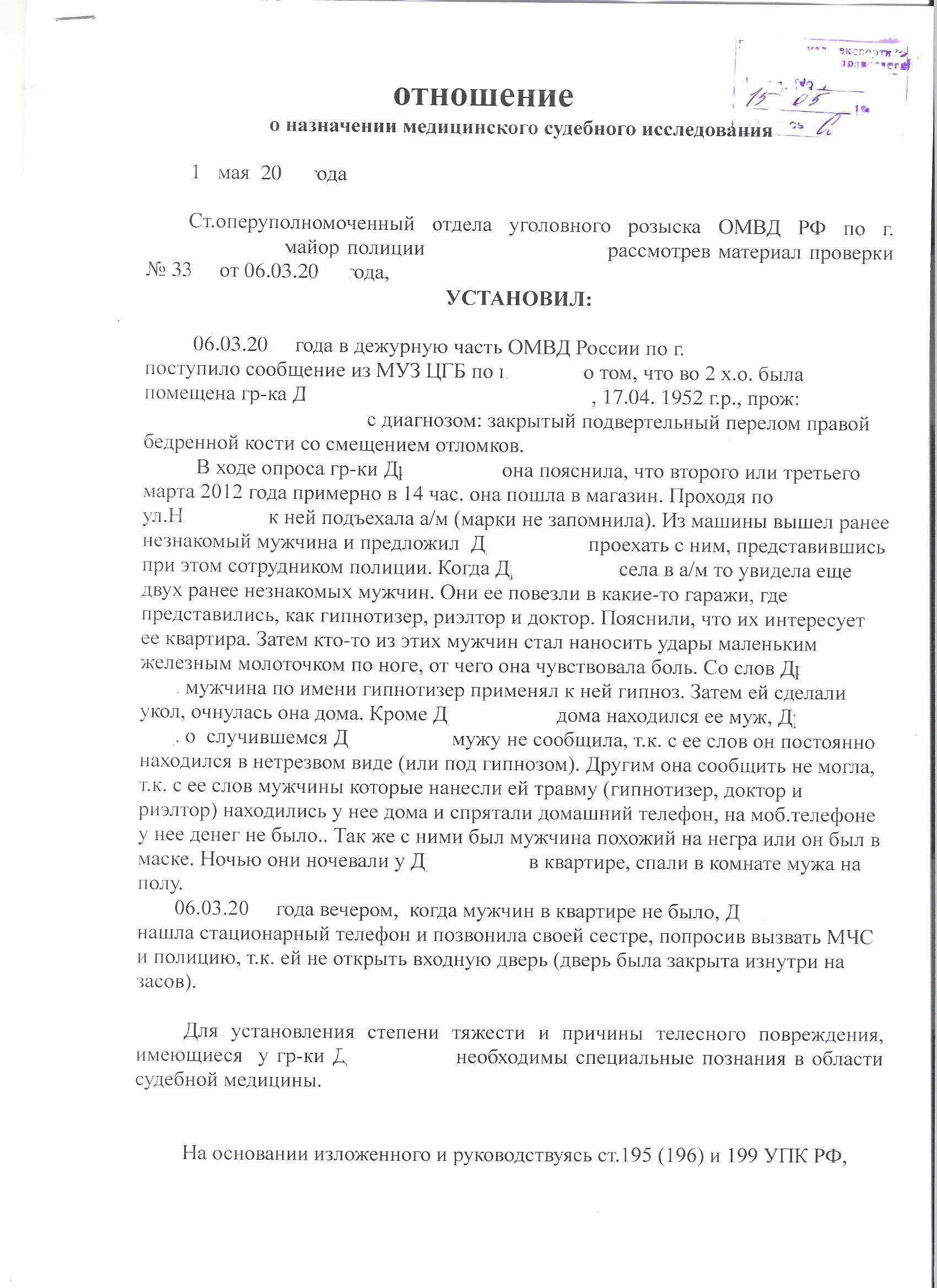 Из протокола осмотра места происшествия: « Большая комната проходит в малую, минуя среднюю и большую, но не самую большую, вернее среднюю, где стоит стенка из-под «кофе» и справка, остатки еды, съестного, пищи и других предметов домашнего обихода, утвари и мебели, особенно справа, а слева вообще остатки пищи, причем несъеденной, обращает на себя внимание банка из-под кофе (кофе нет), на которой по словам криминалиста даже отпечатков пальцев нет, особенно пригодных для идентификации, а справа от двери вообще отпечатков нет..., каких-либо разделений между комнатами нет, если не считать шивонер и диван. ... Труп лежит на диван-кровати-туфте головой к шивонеру, в штанах руки согнуты, скрещены при чем одна выпрямлена и откинута перед грудью человека-трупа... Голова лежит по левой половине живота и свитер пестрый... На трупе надето: майка с длинными рукавами, правый длиннее... Рубашка оторвана вместе с тканью, пуговицы застегнуты и оторваны все по левому белому шву..., проймы на взгляд не повреждены... Брюки изъяты до верхней трети бедер ... Трико специальное до верхней трети бедер ..., внизу неискусственная ткань ... Под одеждой холодная кожа трупа ... Трупные пятна на глаз не ясные, особенно на лице и во всех других группах мышц ... Из отверстий рта и носа множественные ссадины... Округляется перелом нижней челюсти ... Ходовые ходы свободные ... кисти рук обильные...».
