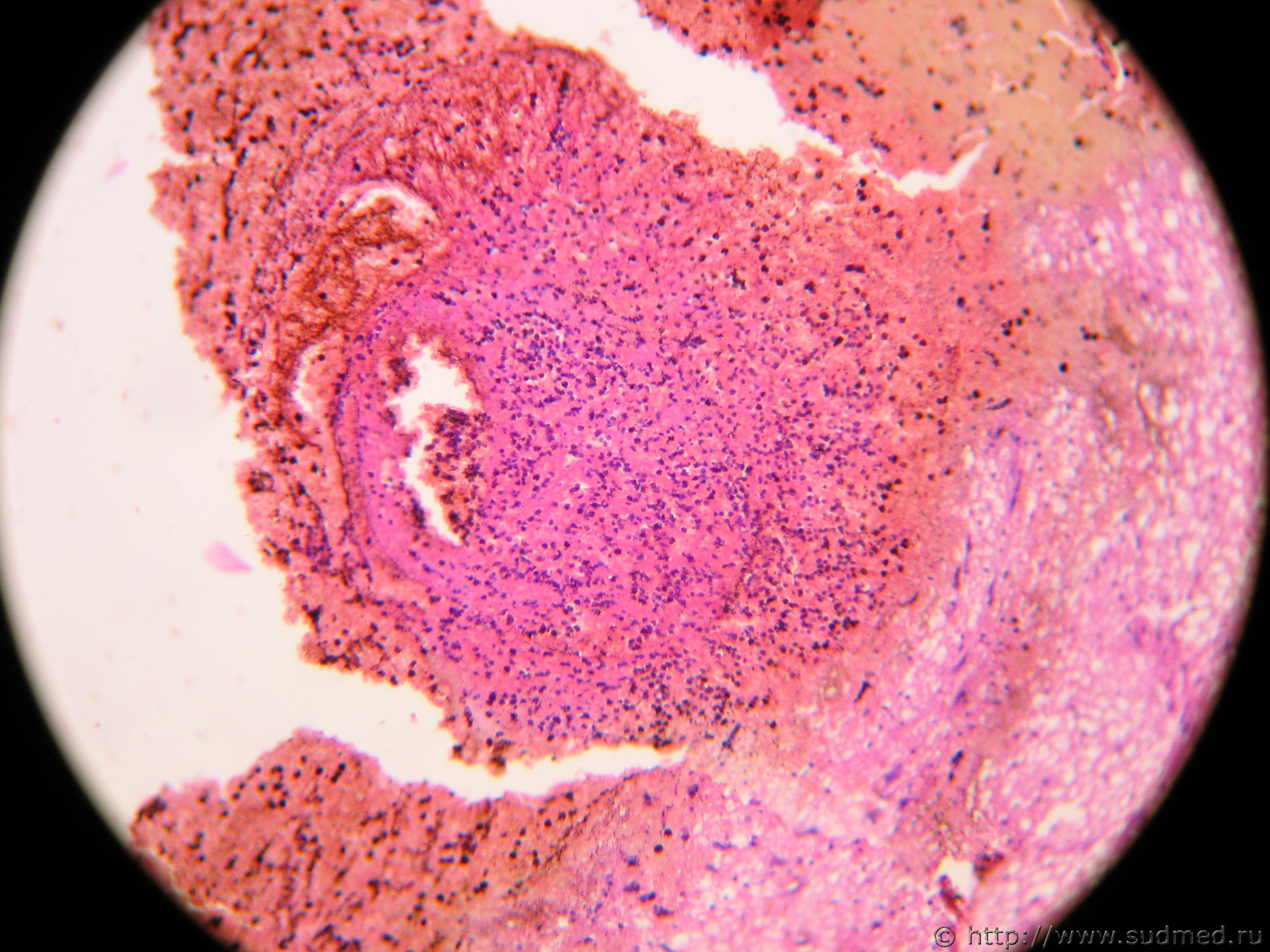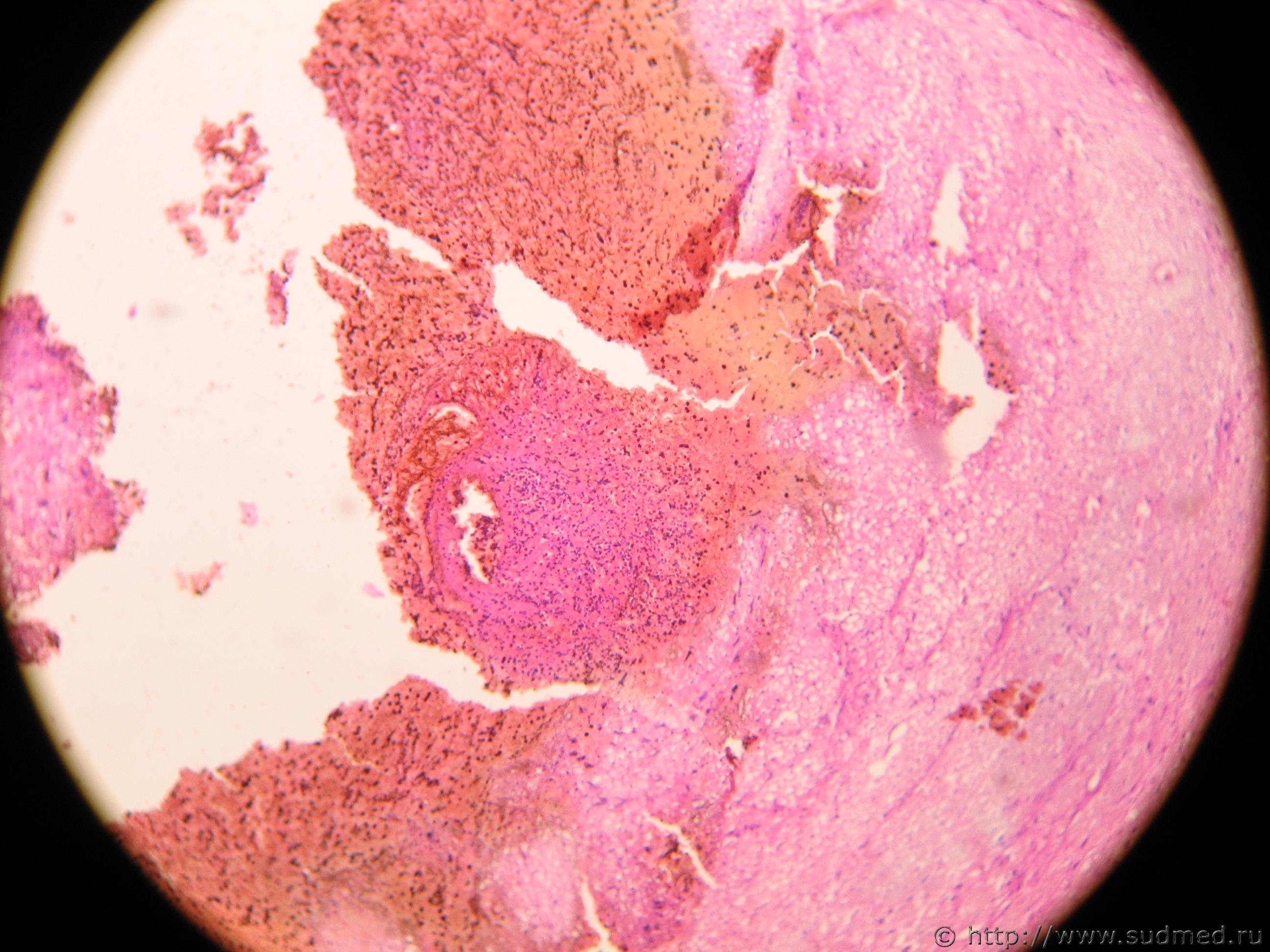 сосуд з фибриноидным некрозом и лейкоцитарной инфильтрацией стенки? или сверток крови? . Вижу первое.Это не свёрток крови. На остальных двух снимках (Х40) периваскулярные крововизлияния, но с некротически ли изменёнными стенками? Жаль,плохо видно.Уже смотрю с помощью лупы.На третьем фото слева похоже,что стенка артериолы в состоянии фибриноидного некроза.Изменения в стенке верхней артериолы напоминает фибриноидный некроз. Заинтриговали.Есть ли возможность представить на обозрение Акт исслед.трупа? |