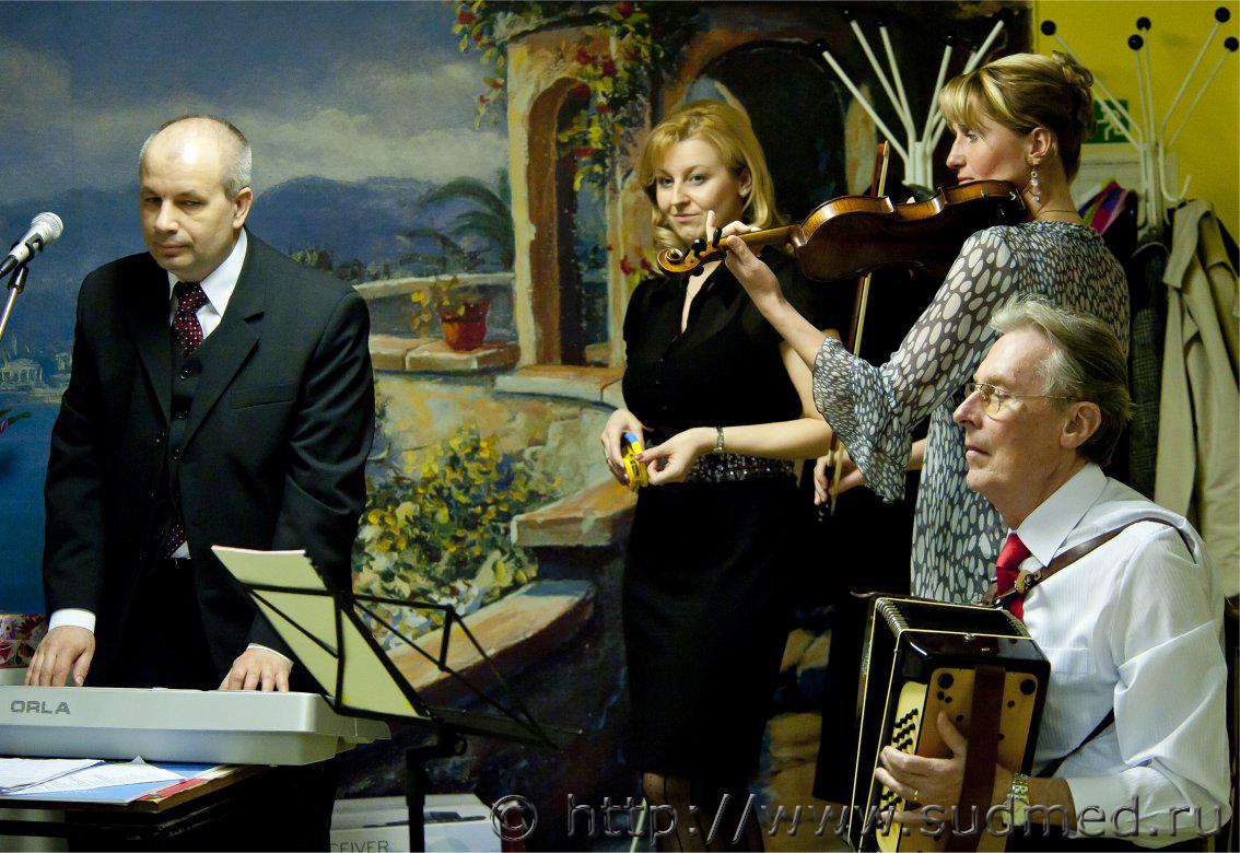 У нас вполне приличная и боеспособная группа экспертов-музыкантов "SM-band" (я на клавишных, доцент Франтишек Л. на аккордеоне, Сильвия Ф. на скрипке, Андреа Б. на перкуссии), зажигаем на наших корпоративах, конференциях и съездах, исполняем всё, что знаем (в основном на словацком, английском и венгерском, из русских песен тут очень популярны "Калинка", "Очи черные", "Катюша", песенка Крокодила Гены о дне рождения, "В лесу родилась елочка", "Мы едем-едем-едем"). Пишем актуальные судебно-медицинские тексты на мотивы популярных словацких песен. Есть аматерские видеоролики с последних конференций, но мы их не выставляем. Прилагаю фото с последнего вечера отдыха Комитета по надзору за здравоохранением, куда входит наша суд.-мед. служба.