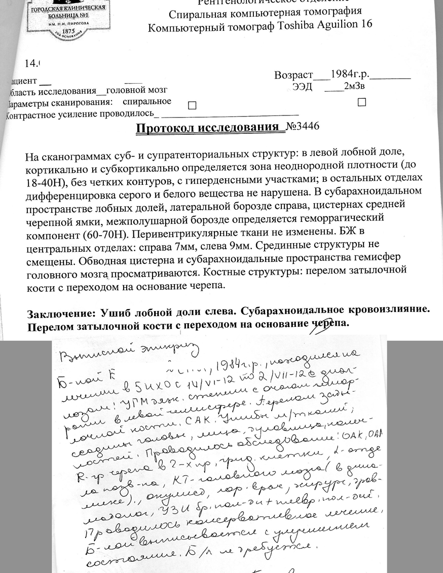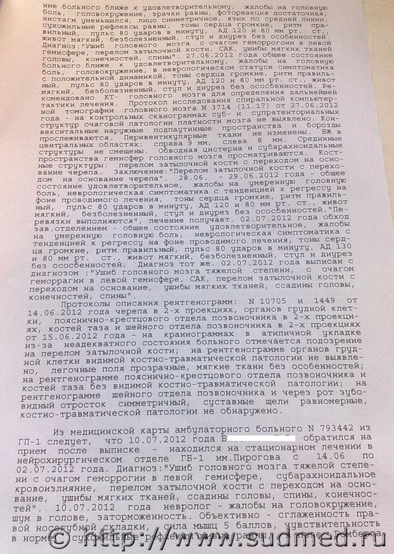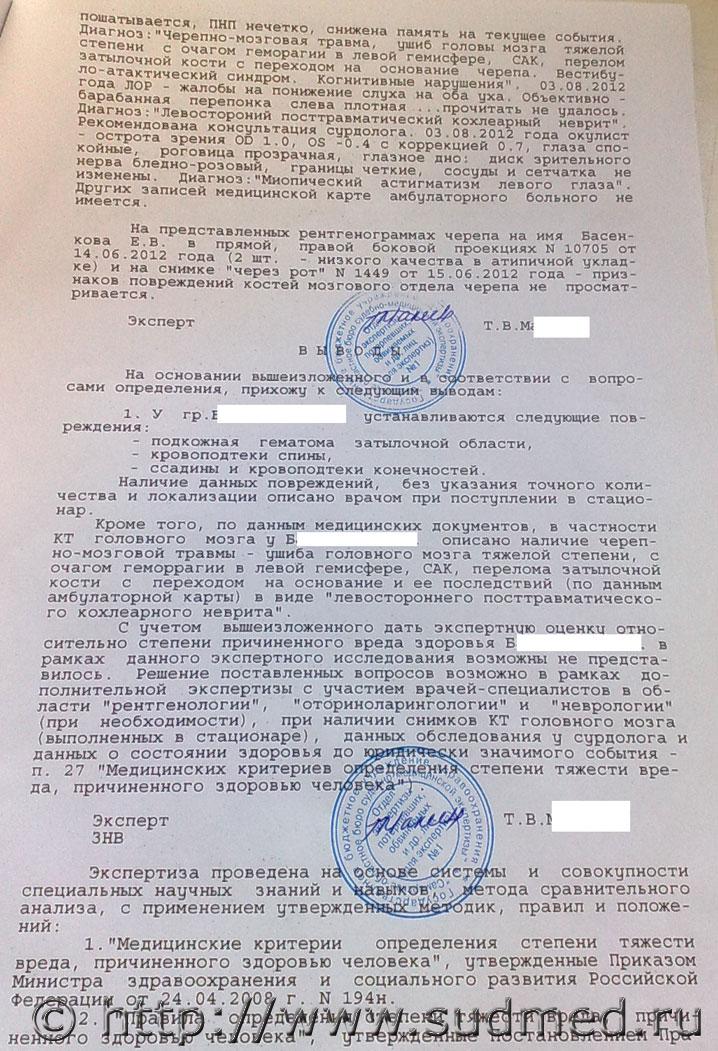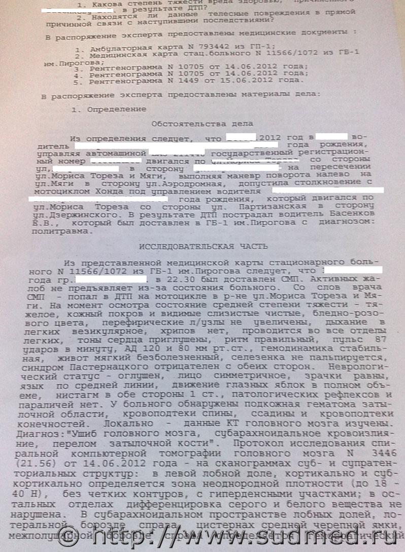 Летом 2012г стал потерпевшим, в результате ДТП был сбит, 4 дня в предкомовом состоянии (сопор), наступила глухота в левом ухе, чувство равновесия до сих пор не восстановилось, из памяти кратковременной многое улетучивается. Вот также приложил все содержательные страницы суд. мед. экспертизы, которая НЕ установила степень тяжести вреда здоровью. На основании такого заключения в ГИБДД административное дело в отношении водителя виновника прекращено. Повторную экспертизу ГИБДД назначать не будет. приходил в суд. мед. экспертизу для проведения платной экспертизы - принимающий эксперт (кто кстати и писал данное заключение "ниочем") сказал, что смысла в проведении платной экспертизы нет - вывод будет также "не представляется возможным дать оценку". Я в тупике.. Виновник ниразу не пришел, не вышел на связь, никаких извинений и т.д. Теперь еще и нет оснований к привлечению его к ответственности. Выкладывая здесь сканы экпертизы и обрисовав ситуацию, прошу уважаемых экспертов дать ответы: 1. Является ли вывод эксперта действительно профессиональным, верным и возможно ли его оспорить? 2. Что предпринять в данной ситуации для все-таки установления степени тяжести вреда здоровью ? В нашем городе только одна суд. мед экспертиза, которая дала результат "не представляется возможным" |