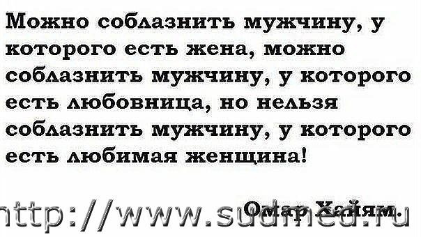 Женщины! Не любите холостых мужчин. До вас не женились и на вас не женяться. Не любите вдовцов. Своих жен до могил довели и вас в гробы загонят. Не любите разведенных. Своих жен бросили и вас бросят. Любите женатых мужчин. Своих жен любят и вас любить будут.