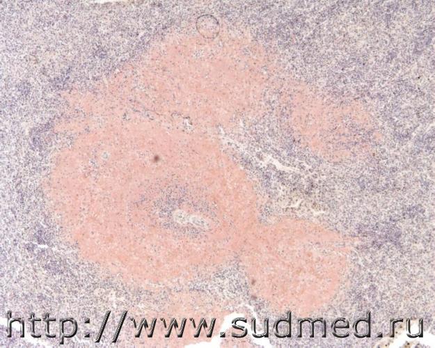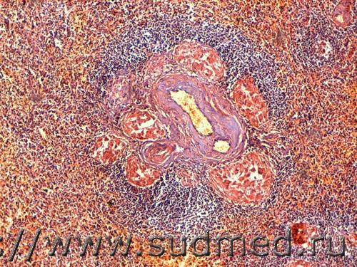 Микро : амилоидоз селезёнки.Окраска конго красным.