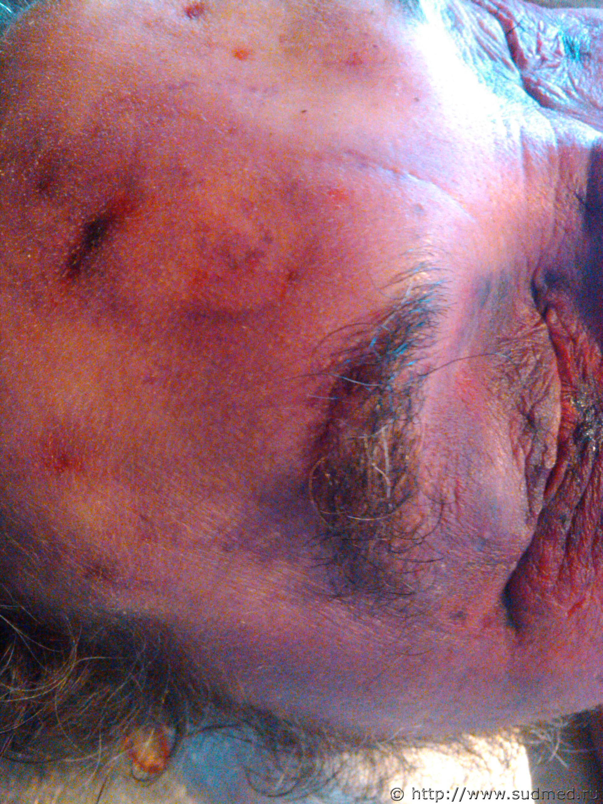 Ув.коллеги! помогите описать, подобное вижу в первые, удар горлышком бытлки (с закрытой пробкой) из под портвейна. Да, фото не очень. И масштабная линейка не помешала бы, но думается фото не для фототаблицы. Если я правильно понял, в центре фото, дугообразные кровоподтеки, немногим выше правой брови? Если не знаю как описать, описываю как вижу, в рамках правил, примерно так: локализация, 2 кровоподтека с четкими контурами, дугообразные, описываю 2-е дуги, куда ориентированы выпуклые стороны, расстояние между концами дуг (условно №1,2 или внешняя и наружная), затем их ширину, расстояние между краями дуг в верхней выпуклой части, у концов, если одно, то на всем протяжении и цвет в конце. Если четко полукруг, то можно извратиться и указать радиус полукруга транспортиром))) |