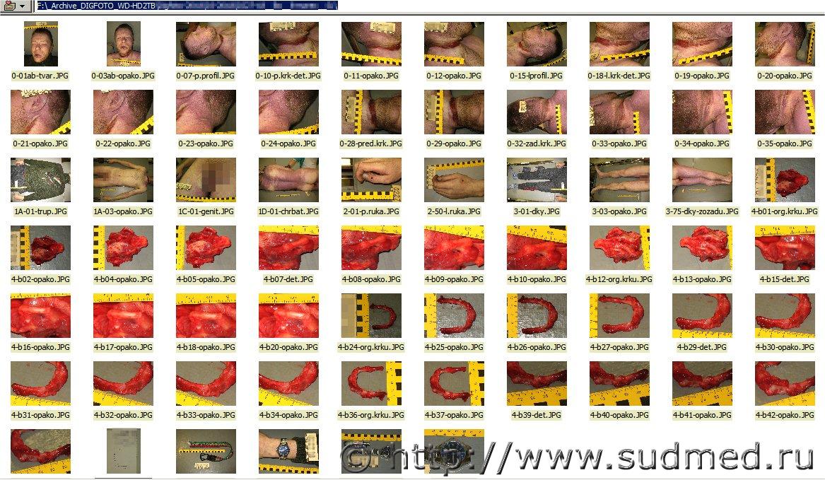 Консультируемый случай является еще одним доказательством того, что фото- и видеодокументация эксперту при вскрытии необходима, и документировать необходимо ВСЁ, как с повреждениями, так и без повреждений. Труп в одежде и без одежды, трупные пятна, странгуляционную борозду со всех ракурсов, руки, хрящи гортани и подъязычную кость, раздутые легкие, опухолевидное образование на правой почке, саму веревку (должна быть экспедирована на вскрытие с сопроводительным листом вместе с мертвым телом, потом уже можно договориться со следователем, что с ней делать дальше). Прилагаю так навскидку фототаблицу с одного такого нашего случая. Полностью с Вами согласна. А самое главное, чтобы на МП при осмотре трупа всегда присутствовал эксперт или врач. В моём случае была Скорая помощь на МП, но врача не привлекли к ОМП по непонятным мне причинам, при этом со слов следователя эксперт местного БСМЭ отказалась выезжать, а в протоколе ОМП имеется подпись за неё, выполненная с подражанием её почерка, что подтвердили почерковедческие экспертизы. Считаю, что, если бы на МП присутствовал эксперт и описал бы трупные пятна так как они зафиксированы в акте СМИТ через 30 минут после окончания ОМП, то уже в 2008 году было бы возбуждено УД по ст.105 УК РФ, т.к. несоответствие расположения трупных пятен положению тела является признаком инсценировки самоубийства, т.е. если труп находится в вертикальном положении, то это исключает наличие трупных пятен на задней поверхности тела.У нас на кафедре собралась коллекция из пронумерованных, описанных и запакованных удавок (всего около 200) - веревки, шнуры, буксировочные тросы, цепи, ремни, подтяжки, поводки для собак, галстуки, разорванные и связанные вдоль полотенца, несколько "самодельных" удавок сплетенных, связанных с использованием скотча, изоленты. Хотим в музее сделать большой стенд: удавка, а под ней качественная фотография СБ и короткое описание случая. Ваш "полусгнитый" бельевой шнур бы у нас точно никуда на пропал. |