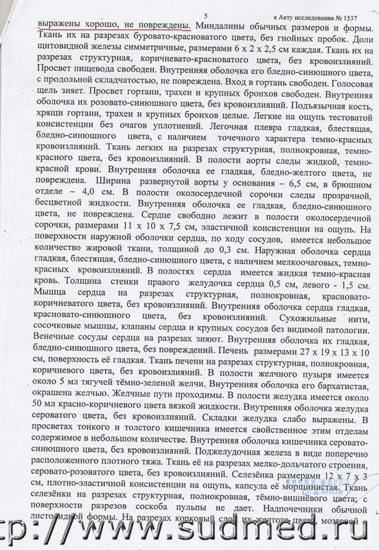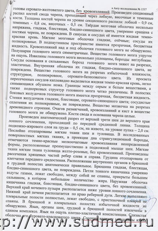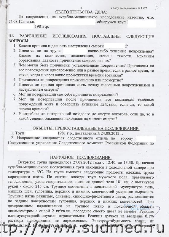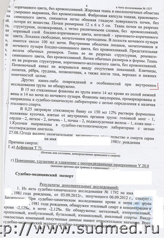 нет, не каталептическое. Не придумывайте лишнего и вправду сформулируйте вопросы Вопросов много, не знаю с чего начать. Там следователь предпочёл с.б. не фотографировать. Вообщем следователь много чего натворил,его быстренько уволили. Второй, которому материал передали, кричит, что не знает что с досташимся наследством делать. СМЭ говорит, что все вопросы к следователю, а следователь посылает к СМЭ. Вот я и решила прийти сюда,где много экспертов,в надежде,что помогут разобраться в актах и понять что произошло на самом деле. Я через 2 месяца после смерти ездила в область к эксперту с большим стажем работы.Он прочёл все акты, протоколы первого и второго(состоявшегося почти через 2 месяца) осмотров м.п. посмотрел фото и сказал " Дочка,тебе исгумации добиваться надо". Больше, к сожалению ничего не объяснил. Я тогда вообще ничего не понимала,но знала что исгумацию не переживу,да и ещё надеялась на следствие. Надежда не оправдывается... Вопрос: можно ли как-то определить человек в петлю попал будучи в сознании или нет ? Я знаю,что судебный медик может сказать только живой или мёртвый человек попал в петлю,а сам или нет,это задача следователя. Мне со следователем не повезло, вся надежда на экспертов,что дадут какую-нибудь ниточку к разгадке. СМЭ в акте написал,что "петля затягивалась под тяжестью тела". Вопрос : Что значит затягивалась, если узел был неподвижный? Если задушили шнурком,который оборванный валялся и тут же подвесили на боксёрском бинте,то следа на шее должно быть два? Почему судмедэксперт увидел только одну борозду? Почему следователь написал с.б. незамкнутая,а судмедэсперт указывает замкнутая,ведь разница большая? Может ли человек, страдающий сосудистым заболеванием, быстро и сильно пьянеющий от маленького количества спиртного ( в состоянии лёгкого алкогольного опьянения,после банки пива, не в состоянии держаться на ногах и идти самостоятельно) в данный момент при 2.12 промилле в крови, 2 раза подряд самостоятельно повеситься? Может такая быстрая смерть вообще произошла не от петли ? Да,ещё поясню один момент, дежурный СМЭ на м.п. не выезжал. Хотя теперь утверждает,что он приехал,дал указания следователю,подписал протокол и уехал,а следователь всё перепутал и не так написал. Он тоже утверждает,что с.б. замкнутая. На м.п. его никто не видел. Труп снимали следователь с экспертом-криминалистом. Петлю разрезали и в морг не направляли. Почему на петле-шнурок была кровь,а на боксерском бинте следов крови не было? В каком случае может так быть? |