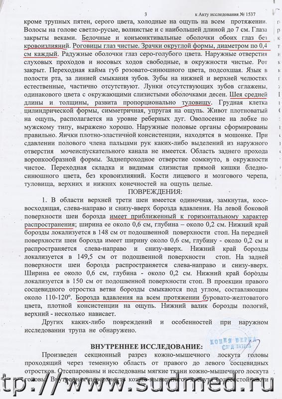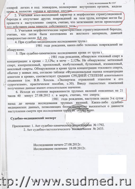 Скорее всего Wlada думает, что это убийство а не суицид. А вопрос какая была бы борозда - всякой разной, глубина бывает и до 0,5 - 1 см, смотря сколько провисел. С установлением времени смерти тоже проблема. Я разговаривала по тел.около 9 вечера 23.08. Последний звонок с сот.телефона был в 12 ночи с 23 на 24.08. в службу спасения.Телефон с м.п. исчез. Запись в МЧС следователь своевременно не взял,хотя я взяв детализацию звонков на 6-й день после смерти,сообщила ему об этом.Потом запись была,за невостребованостью и по истечению установленного срока уничтожена. Я приехала и обнаружила 24.8. в 17:30. Следователь в протоколе написал " трупные пятна расположены на нижних конечностях красно-фиолетового цвета, т.о. хорошо выражено во всех группах мышц". |