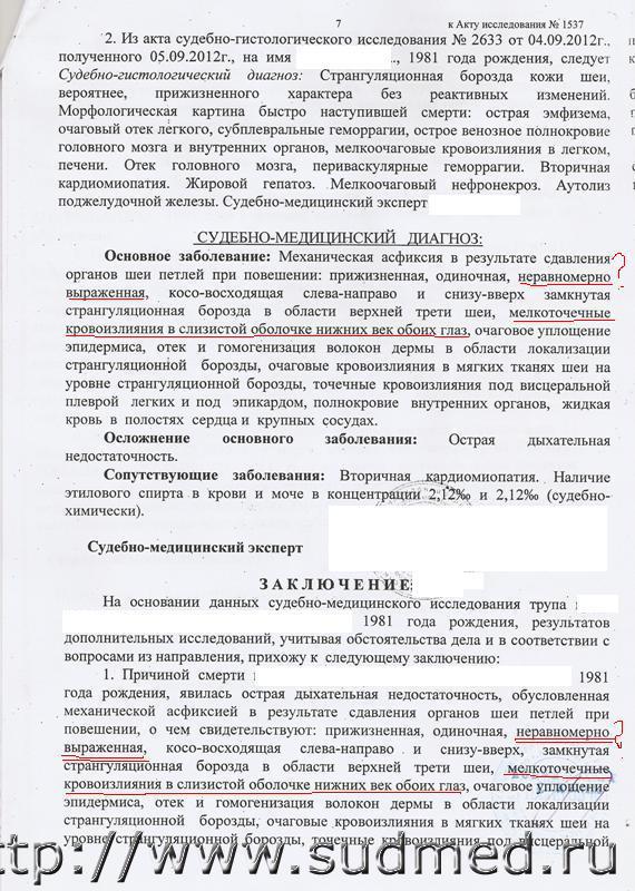 Цитата Следователь в протоколе осмотра писал с.б. незамкнутая, судмедэксперт пишет замкнутая. Фотографии на вскрытии не делались почему-то., с м.п. осталось только 2,на которых с.б. нет. актуально то, что написал в акте СМЭ, следователь в протоколе мог написать "не так услышал, не то понял". Цитата СМЭ говорит, что все вопросы к следователю, а следователь посылает к СМЭ. Вот я и решила прийти сюда,где много экспертов,в надежде,что помогут разобраться в актах и понять что произошло на самом деле. что произошло на самом деле мы вряд ли Вам поможем ибо это вопрос следствия, во всяком случае по тем данным которые имеются, кроме того, что причина смерти наступила в результате повешения и похоже прижизненного вряд ли больше что-то можно сказать Цитата Вопрос: можно ли как-то определить человек в петлю попал будучи в сознании или нет ? Я знаю,что судебный медик может сказать только живой или мёртвый человек попал в петлю,а сам или нет,это задача следователя. Мне со следователем не повезло, вся надежда на экспертов,что дадут какую-нибудь ниточку к разгадке. здесь Вы сами ответили на свои же вопросы Цитата СМЭ в акте написал,что "петля затягивалась под тяжестью тела". Вопрос : Что значит затягивалась, если узел был неподвижный? имелось в виду что сдавление шеи петлей произошло под тяжестью тела, что значит "затягивалась под тяжестью тела" надо спросить у эксперта Цитата Если задушили шнурком,который оборванный валялся и тут же подвесили на боксёрском бинте,то следа на шее должно быть два? Почему судмедэксперт увидел только одну борозду? что значит "если", какие данные есть, что имело место удушение, а потом повешенье? никаких Цитата Может ли человек, страдающий сосудистым заболеванием, быстро и сильно пьянеющий от маленького количества спиртного ( в состоянии лёгкого алкогольного опьянения,после банки пива, не в состоянии держаться на ногах и идти самостоятельно) в данный момент при 2.12 промилле в крови, 2 раза подряд самостоятельно повеситься? бывает все, в том числе и не держаться на ногах от банки пива. Что значит "два раза повеситься" не понятно Цитата Может такая быстрая смерть вообще произошла не от петли ? вопрос абстрактный. Есть акт, в нем результаты вскрытия, которые, повторюсь и повторю других, если соответсвуют действительности, позволяют прийти к выводу, что причиной смерти есть повешение Цитата Почему на петле-шнурок была кровь,а на боксерском бинте следов крови не было? В каком случае может так быть? в каком угодно, хотя бы встречный вопрос - чья кровь? Соболезную Вашей потере и прошу простить. если в ответах Вы не нашли искомого |
