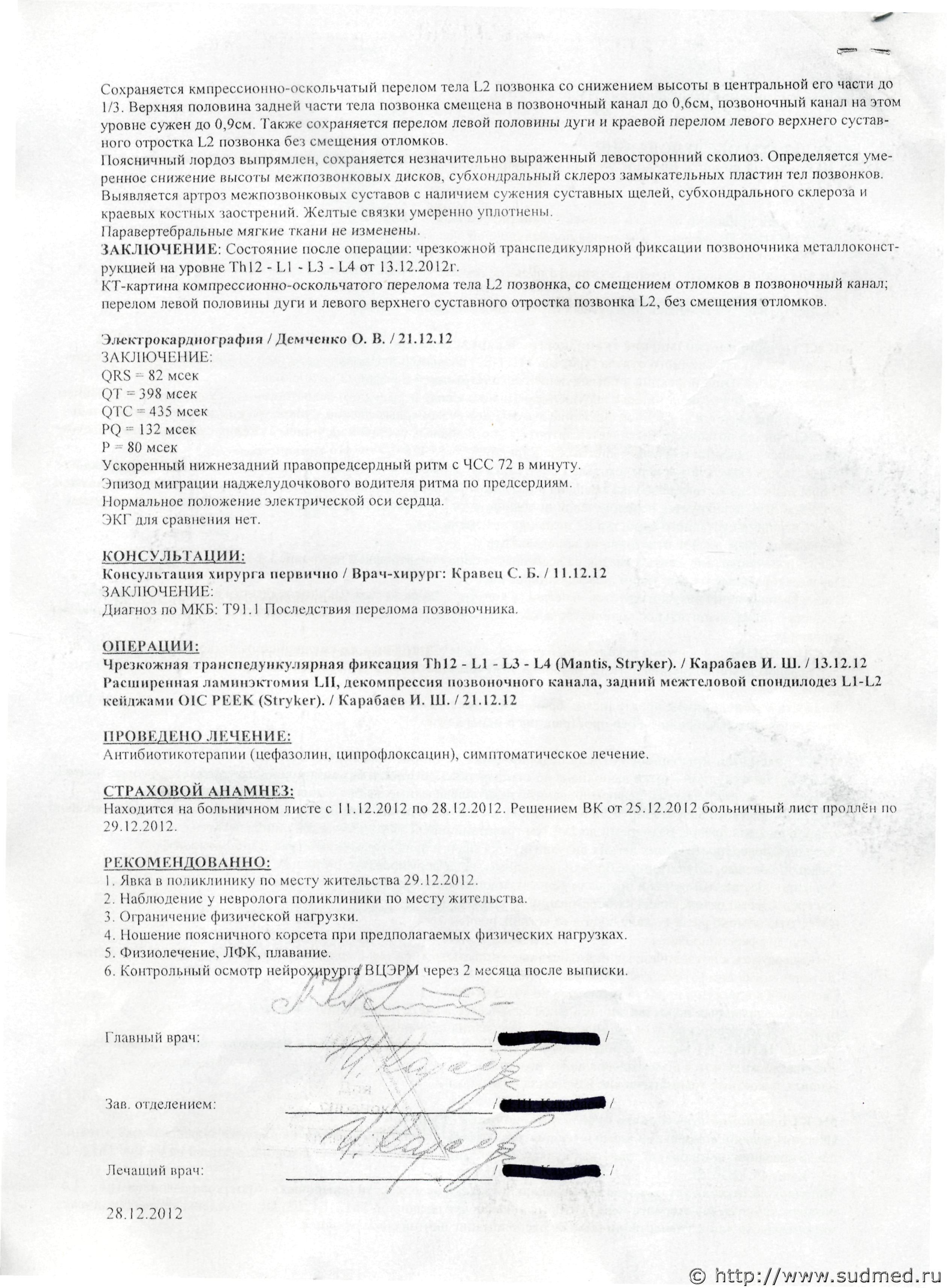 В результате диагноз оскольчатый компрессионный перелом тела позвонка L2. Сделано 2 операции поставили всякие железки и заменили ( поставили мышь) хрящ между позвонками. До сих пор она на больничном уже более 120 дней в июне будут снимать какието железки т к говорят что позвонки не работают. Извените я не медик и может быть что то пишу не правильно. Вчера я узнал что заключение судмедэкспертизы-средняя тяжесть. Заключение еще не видел но не согласен с ним полностью. Вообще возможна инвалидность. Пожалуйста подскажите что делать? |