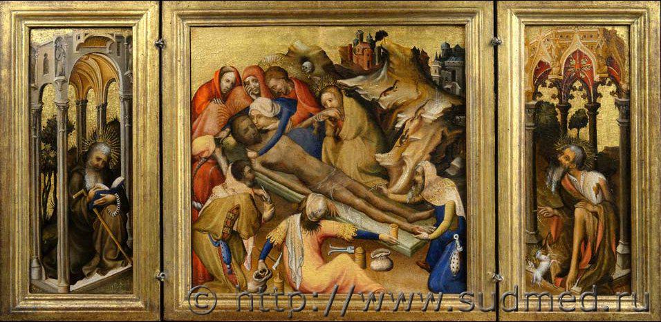 Уважаемый Толстый! Ну почему же сразу фу? Не согласен. Здесь больше истории все-таки, чем фетиша и восхищения (лично для меня). Вот, например, еще одно изображение, на котором запечатлена процедура подготовки (бальзамирования?) тела Христа. Обратите особое внимание на старцев "вногах", а именно на их действия и набор инструментов, разбросанный вокруг... Я только давилку для чесенока разглядел |