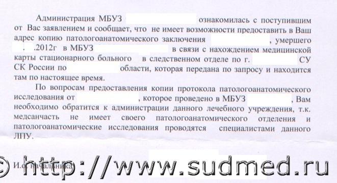 Повторюсь,внимательно читайте ФЗ. Возможно,но патологоанатом не виновен в смерти и больной не умер от вскрытия. Спасибо большое за ответ, но как раз этот протокол мы и не можем получить вот уже 9 месяцев. Обращались с письменным заявлением в Комитет по здравоохранению города, теперь в Министерство здравоохранения областное. Может быть мы неверно его называем? Заключение патологоанатома, а нужен протокол вскрытия... Надо просить протокол? Я прекрасно понимаю, что патологоанатом не виновен в смерти, но все мед. заключения дальнейших комиссий (городской, областной) подстроены под выводы, полученные патологоанатомом. Большое спасибо!  |