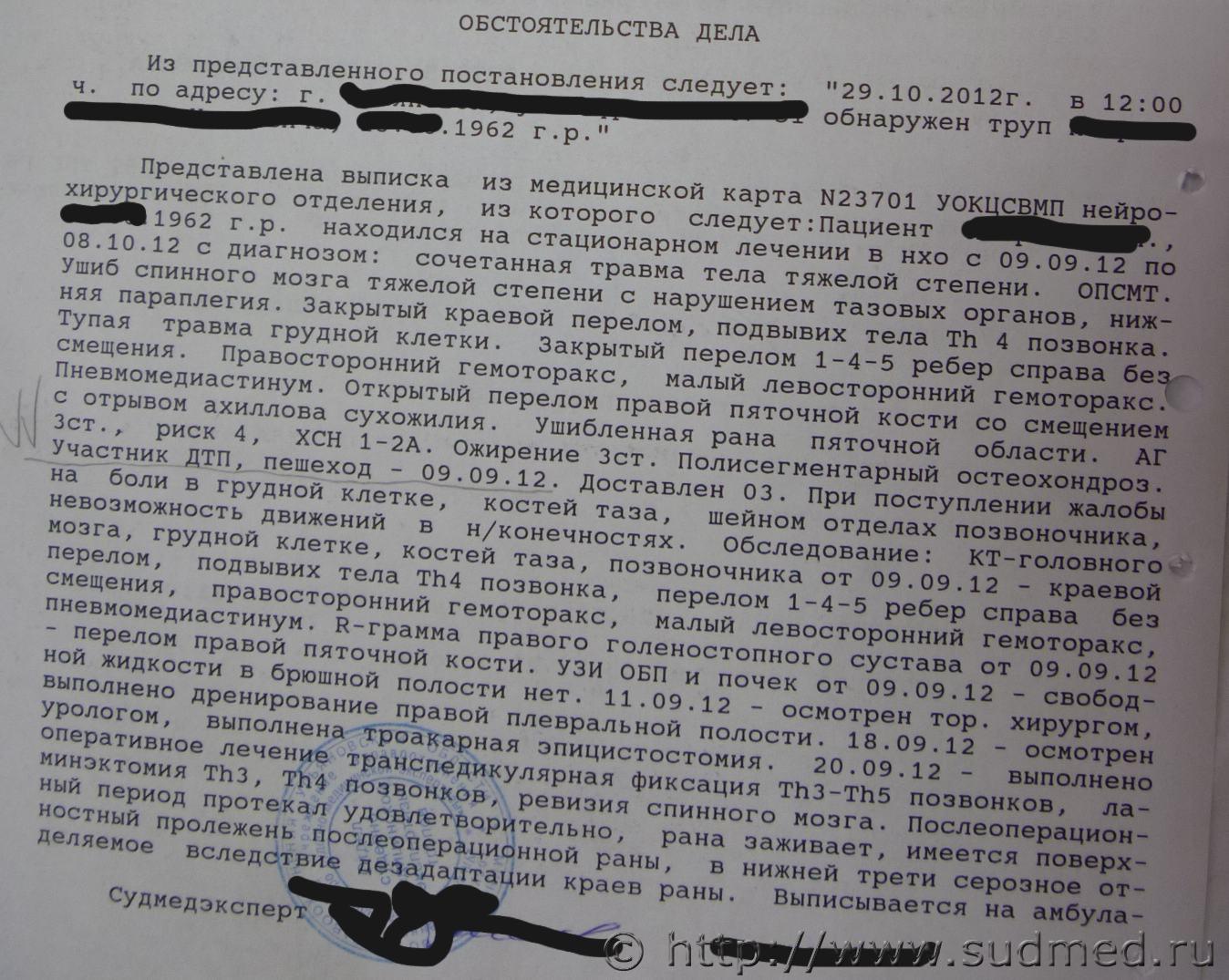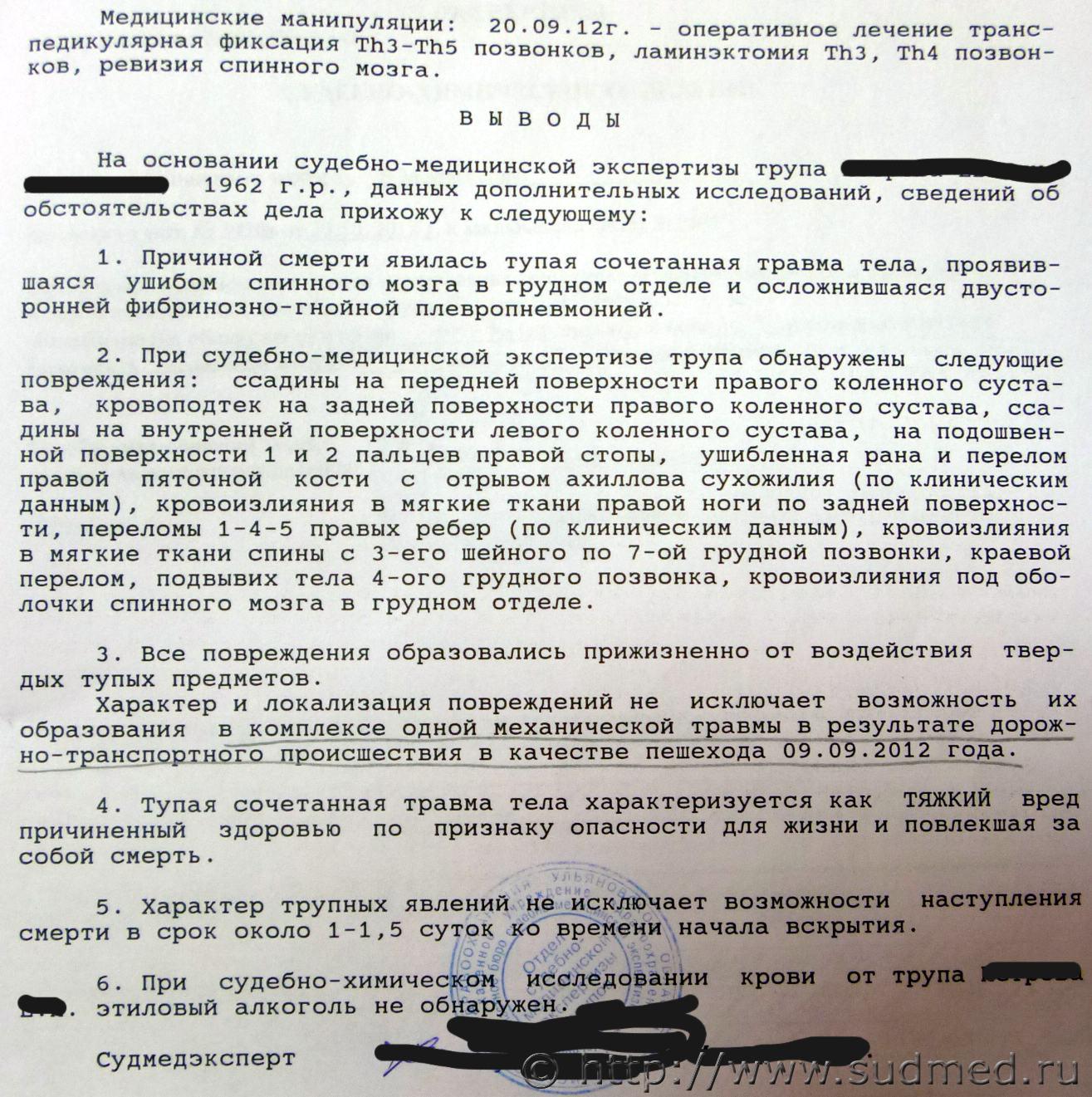 Оцените Заключение эксперта о причине смерти, сочетанная травма при ДТП, месяц в больнице, выписался досрочно, через |