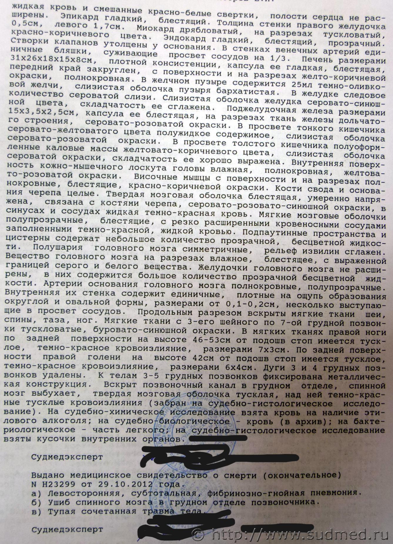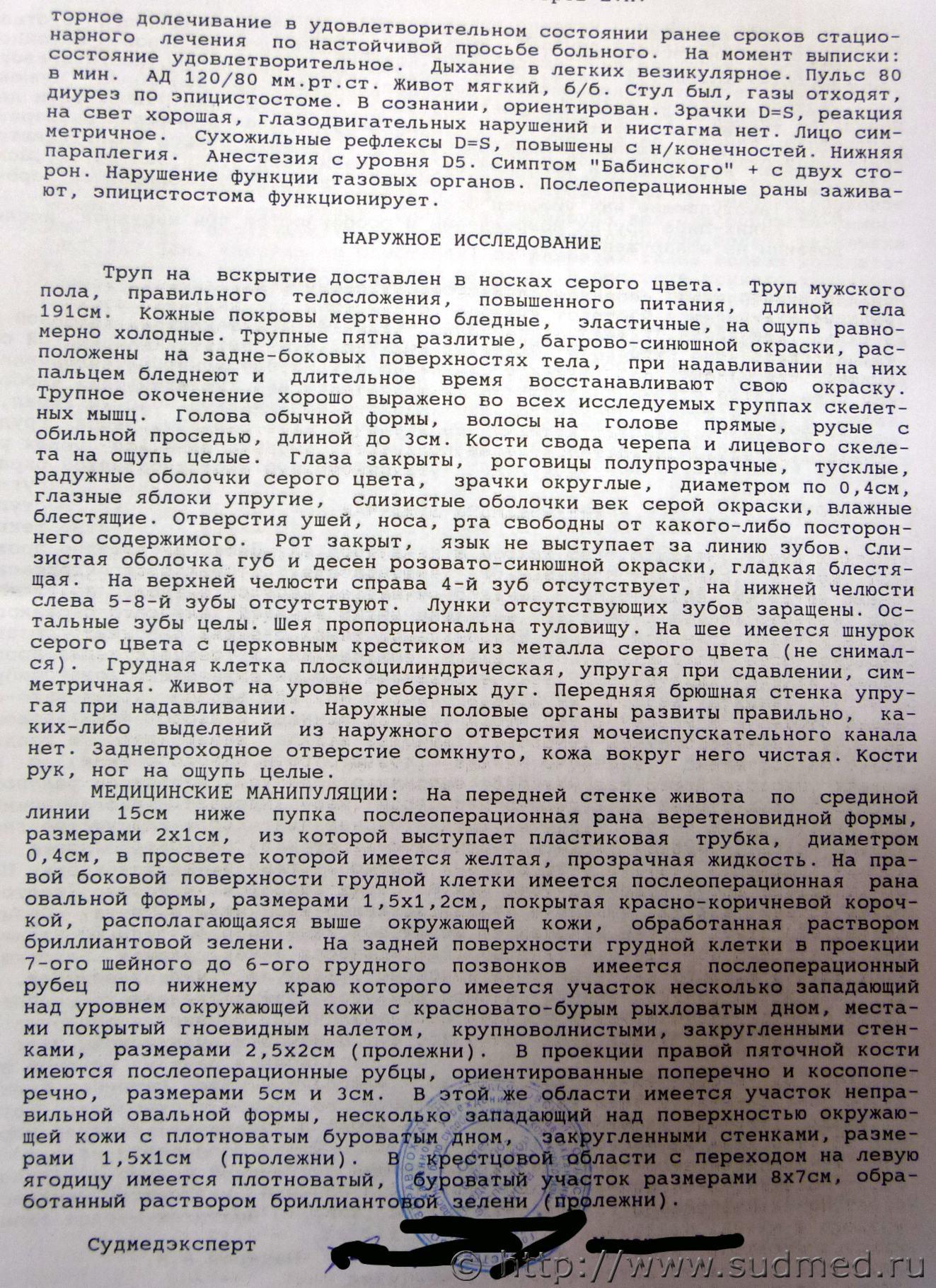 Пневмония расценена осложнением травмы?[/quote] Именно так, все 3 раза - причина смерти - тупая сочетанная травма тела, осложнившаяся фибринозно-гнойной плевропневмонией..... есть еще 20 листов комиссионной экспертизы (там переписывание этой + добавлены выписки их амбулаторной карты потерпевшего еще до ДТП, после ДТП один раз обратился - выписали кеторол, все) Сейчас на основе этой экспертизы собираются судить по 264. ч.3 Можно ли заказать проведение мед-экспертизы у Вас на платной основе? Сильно опасаюсь коррупции можно ответить в скайп |