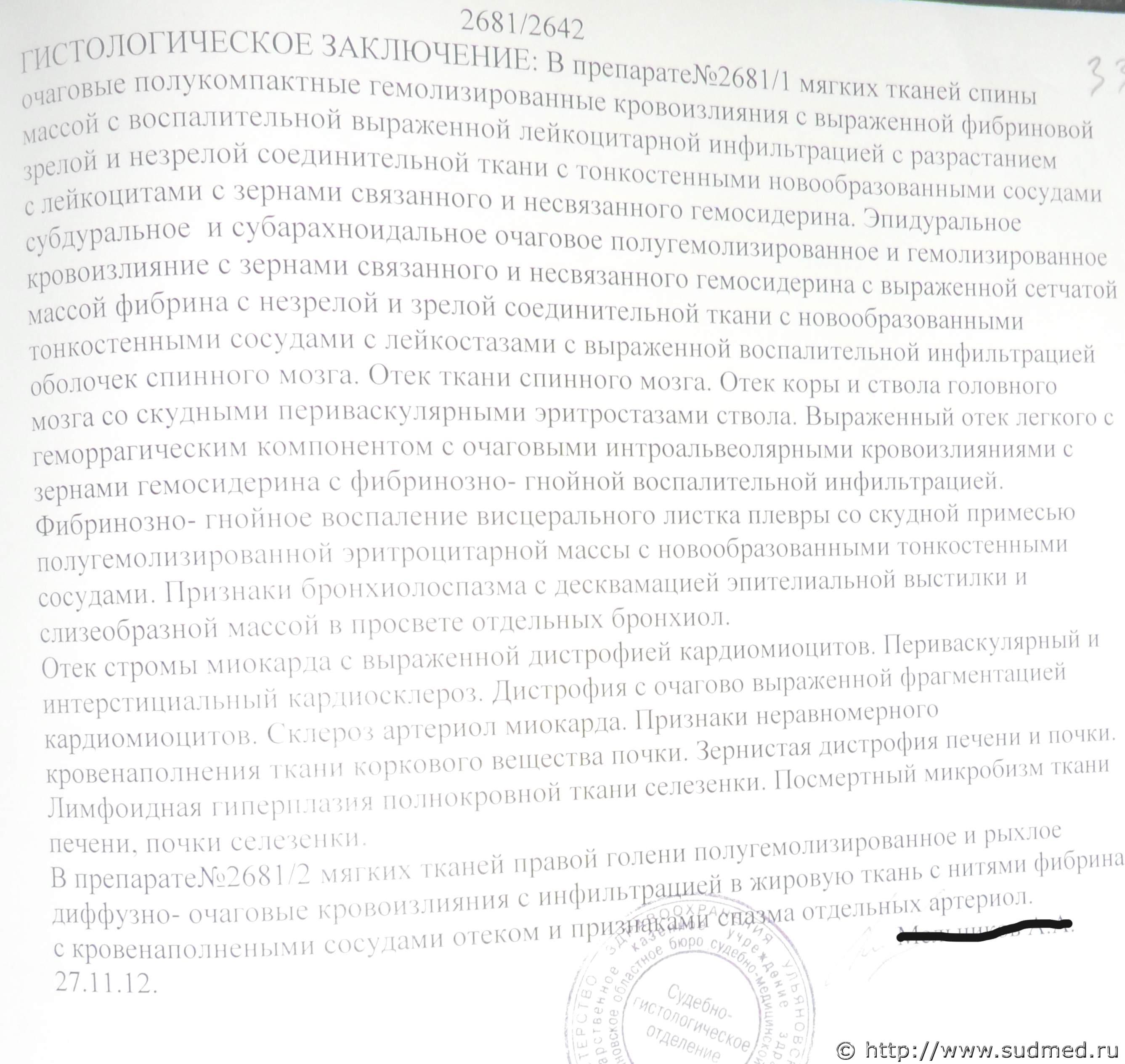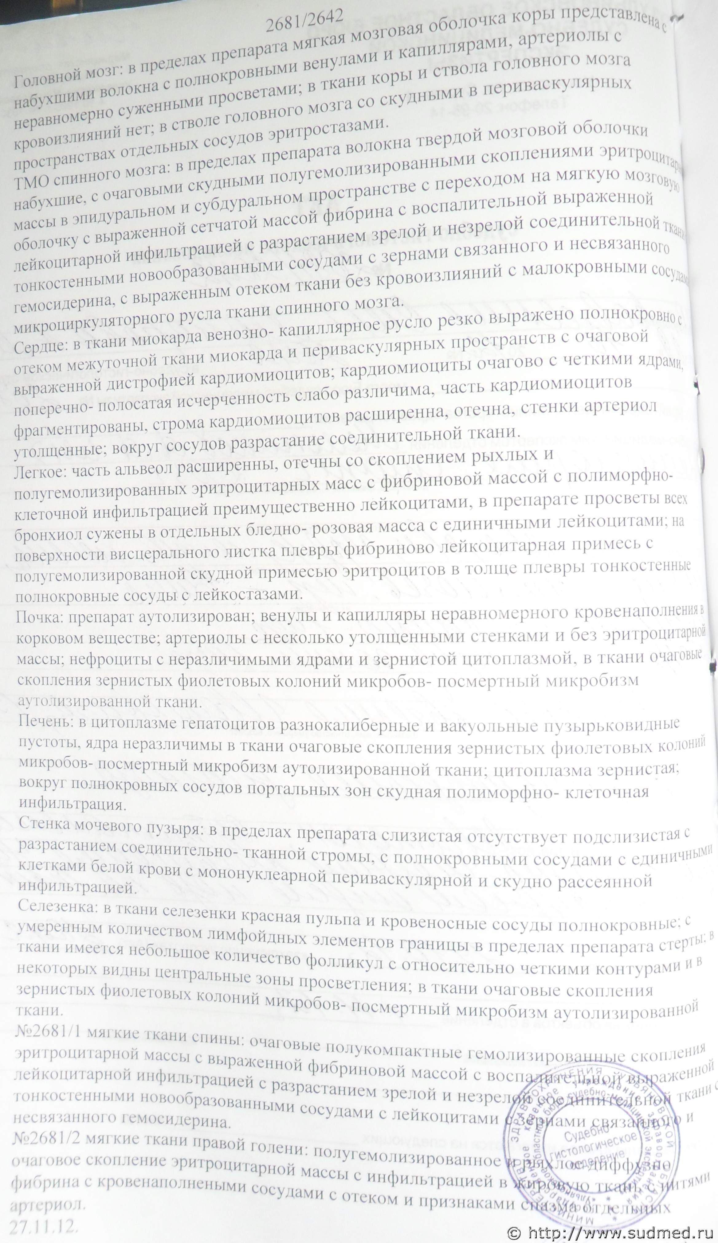 ТМО спинного мозга...с воспалительной выраженной лейкоцитарной инфильтрацией. Лёгкие- от такой пневмонии не умирают,но она есть. В почках,печени,селезёнке колонии микробов.Объясняют это "посмертным микробизмом аутолизированной ткани".Это глупость. Умер 28.10 в 7 часов,а труп вскрывался с 9 до 11 часов 29.10. Мягкие ткани спины ...с воспалительной выраженной лейкоцитарной инфильтрацией. Всё это позволяет предположить наличие сепсиса,но кое-чего микроспически для его обоснования не хватает (быть может связано с квалификацией гистолога).Более того,смэ не взял трупную кровь на бактериологическое исследование. Всё как-то "мутно". |
