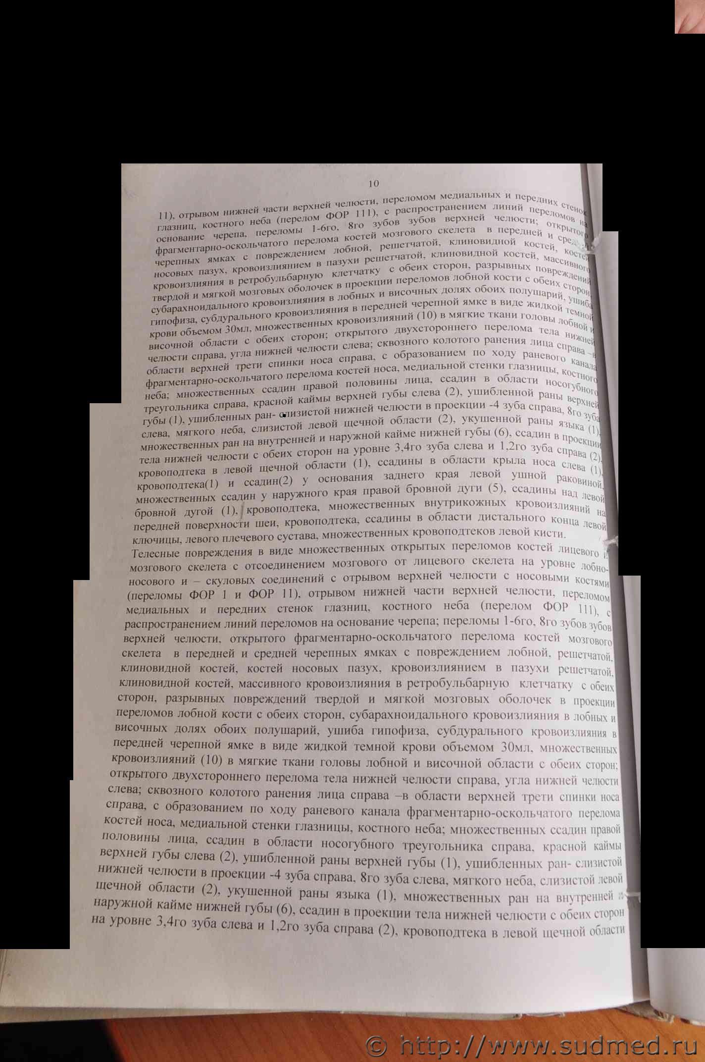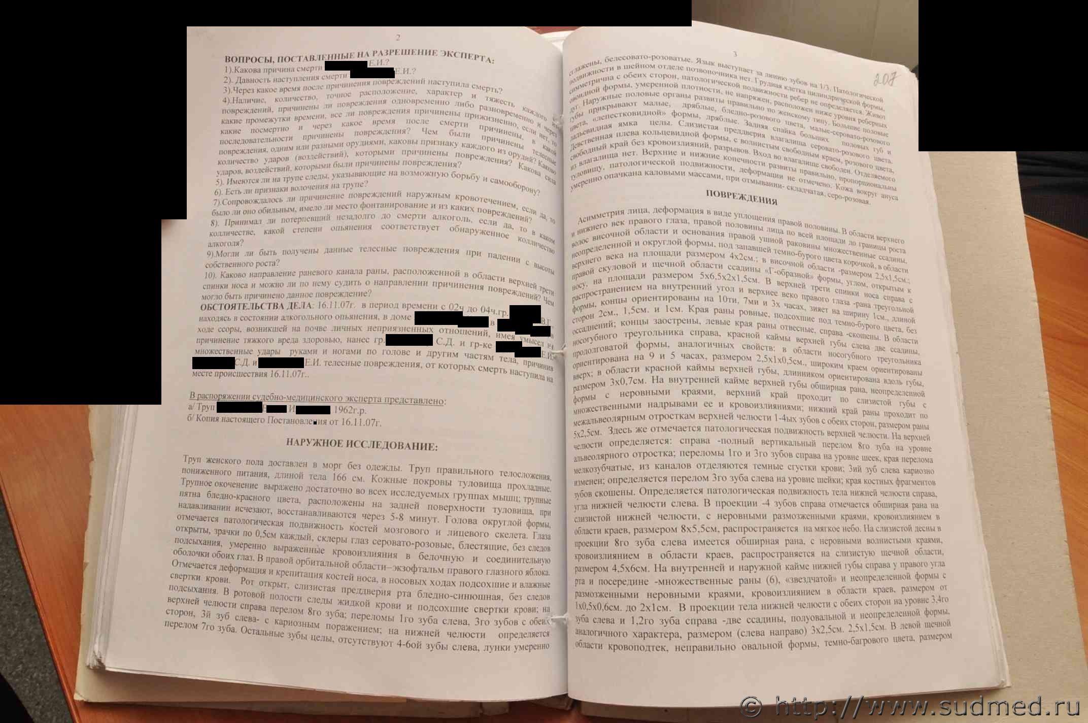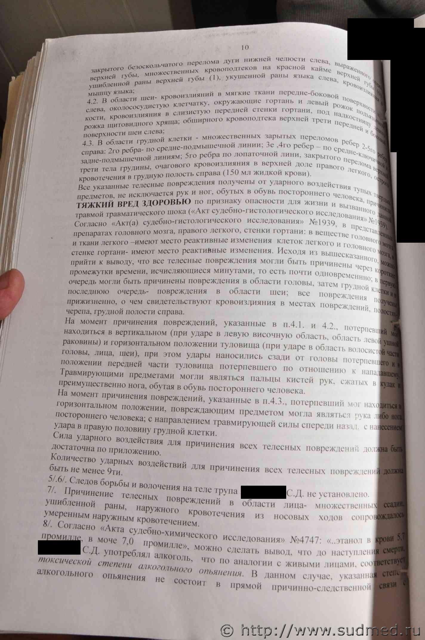 Вполне аргументированные выводы. И какой у Вас по ним вопрос? у трупа ВЫ видели телеснве повреждения в ввиде множественных переломом черепа с отслоением мягкой оболочки от твердой и множественных переломов челюсти,сколов зубов, а на руках в области кисти нет даже ни одного повреждения,ведь согласно СМЭ причинено руками,ногами постороннего человека. На выложенной в файле Экспертизе описание трупа моей сестры,а экспертиза живого лица-Экспертиза моего сына,которого обвинили в ее убийстве.Его првреждения не соответствуют количеству и тяжести ударов. |