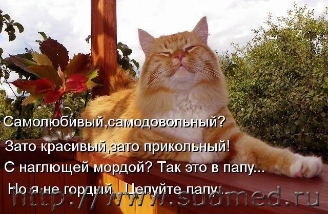 Маленький комочек с коготками, Рыжий и пушистенький проказник, Любящими нежными руками Создан тебе в жизни целый праздник. Ты, как быстрый лучик из окошка, Появился в старенькой квартире; Родила тебя простая кошка, Лучшего котёнка в целом мире. Галина Дядина Я кот в мешке,обычный кот. Мне вот уже десятый год. Меня все время продают, Меня бесстыдно выдают За что угодно, и при том. Ни разу не был я котом! А я мечтаю быть собой! Хочу расправить хвост трубой, Хочу ловить мышей и блох. Я теплый, я уже не так уж плох. Со мной спина не заболит, Я так лечу радикулит! Возьмите нас вдвоем с мешком - Мешок пустой, а я пешком. |